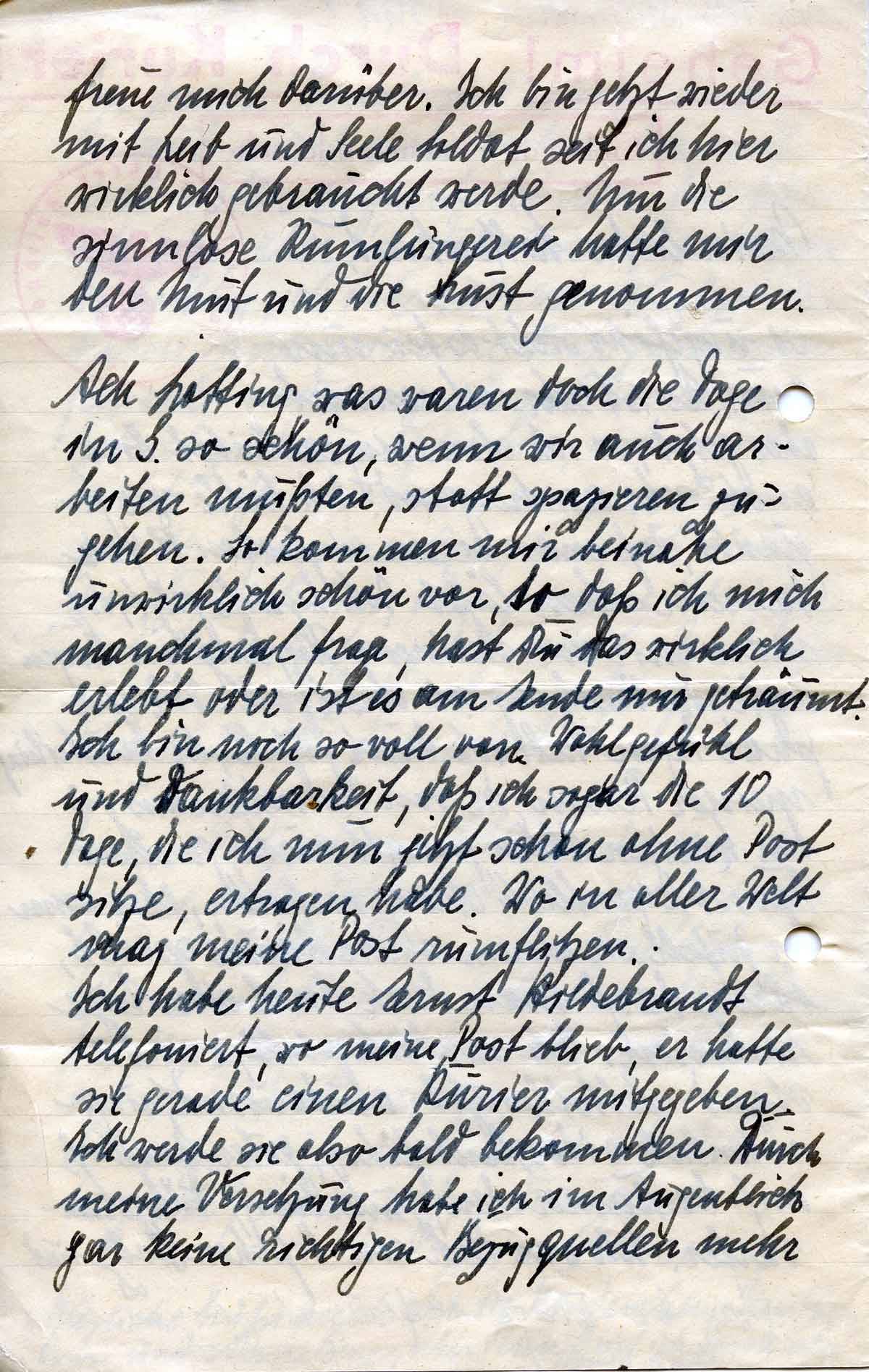 freue mich darüber. Ich bin jetzt wieder mit Leib und Seele Soldat, seit ich hier wirklich gebraucht werde. Nur die sinnlose Rumfurzerei (?) hatte mir den Mut und die Lust genommen.