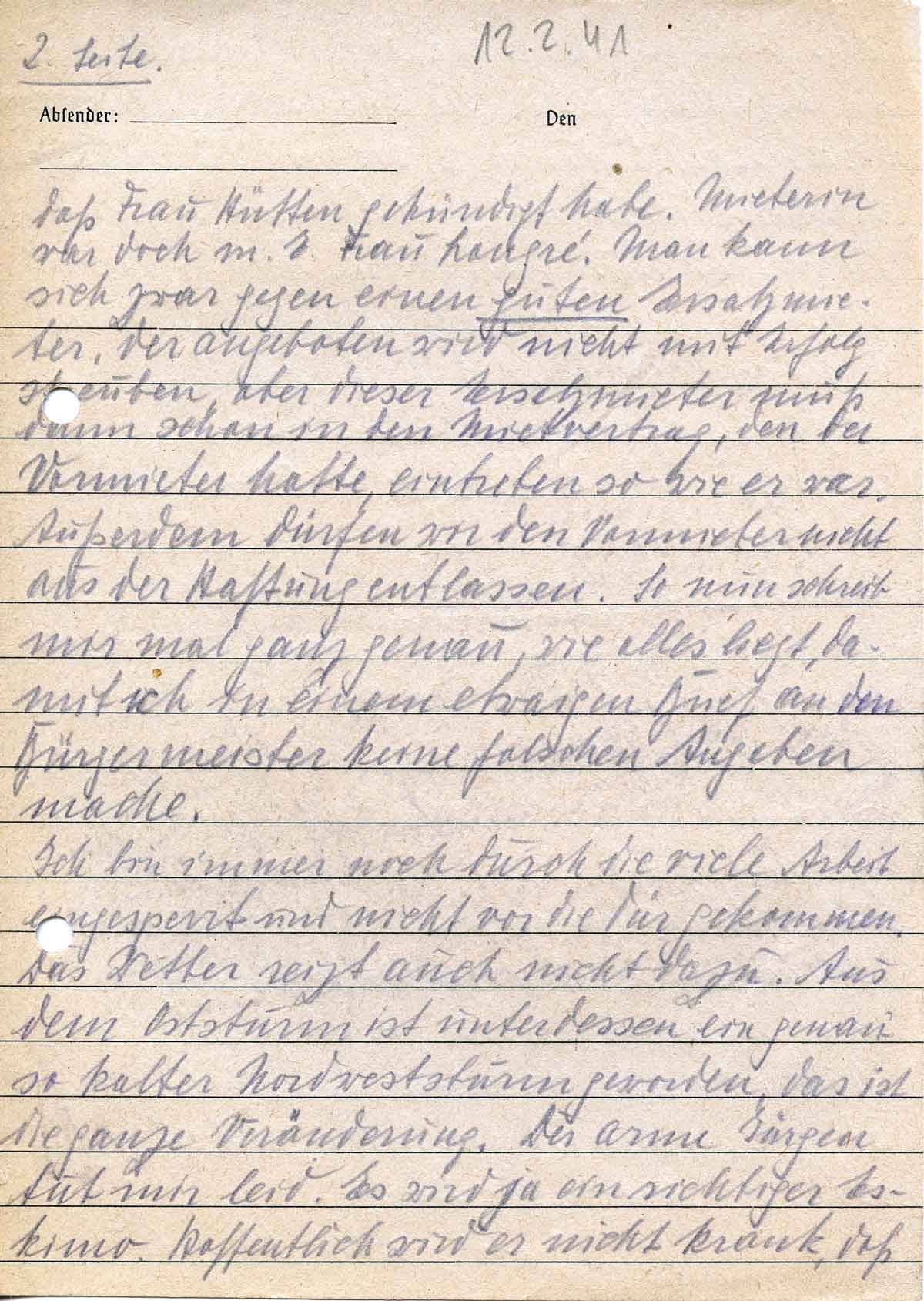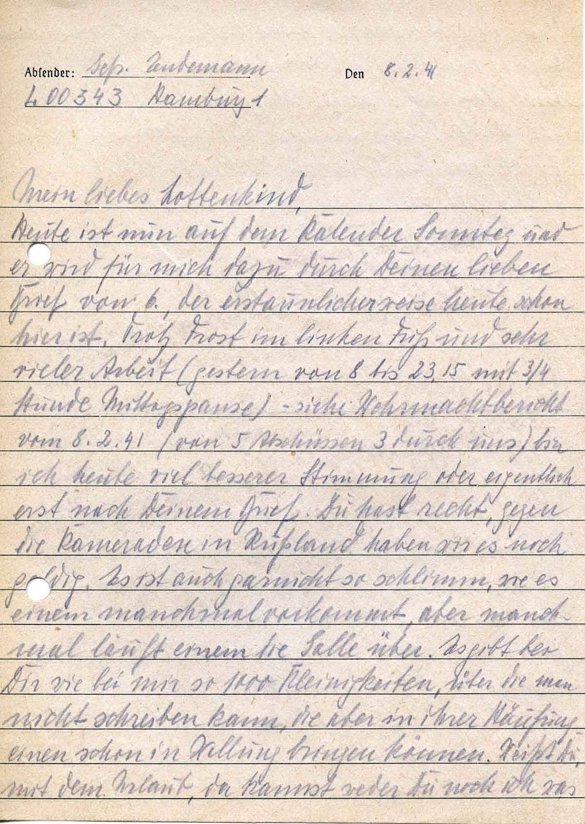 heute ist nun auf dem Kalender Sonntag und er wird für mich dazu durch Deinen lieben Brief vom 6., der erstaunlicherweise heute schon hier ist. Trotz Frost im linken Fuß und sehr viel Arbeit (gestern von 8 bis 23:15 mit ¾ Stunde Mittagspause) – siehe Wehrmachtbericht vom 8.2.41 (von 5 Abschlüssen 3 durch uns) bin ich heute viel besserer Stimmung oder eigentlich erst nach Deinem Brief. Du hast recht, gegen die Kameraden in Rußland haben wir es noch goldig. Es ist auch gar nicht so schlimm, wie es einem manchmal vorkommt, aber manchmal läuft einem die Galle über. Es gibt bei Dir wie bei mir so 1000 Kleinigkeiten, über die man nicht schreiben kann, die aber in ihrer Häufung einen schon in Wallung bringen können. Weißt Du, nach dem Urlaub, da kannst weder Du noch ich was