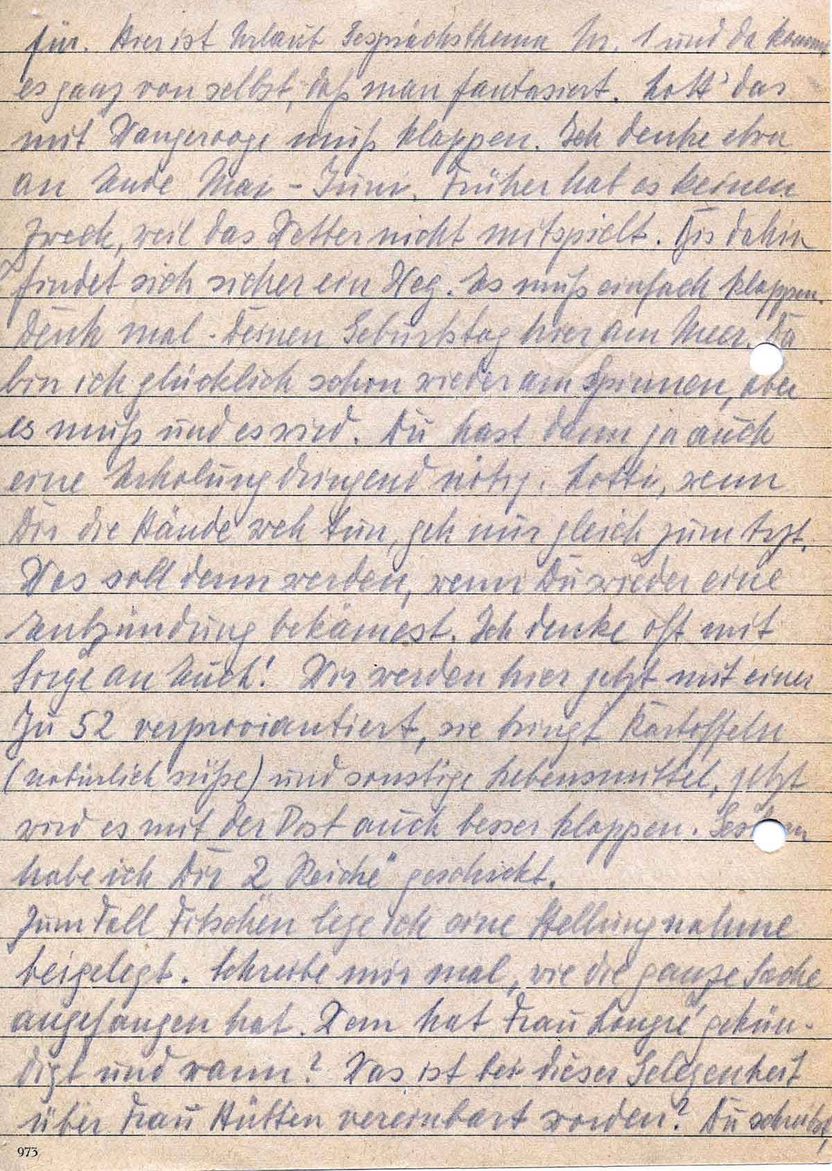 für. Hier ist Urlaub Gesprächsthema Nr. 1 und da kommt es ganz von selbst, dass man fantasiert. Lott, das mit Wangerooge muss klappen. Ich denke etwa an Ende Mai -Juni. Früher hat es keinen Zweck, weil das Wetter nicht mitspielt. Bis dahin findet sich sicher ein Weg. Es muss einfach klappen. Denk mal – Deinen Geburtstag hier am Meer. Da bin ich glücklich schon wieder am Spinnen, aber es muss und es wird. Du hast dann ja auch eine Erholung dringend nötig. Lotti, wenn Dir die Hände weh tun, geht gleich zum Arzt. Was soll denn werden, wenn Du wieder eine Entzündung bekämest. Ich denke oft mit Sorge an Euch! Wir werden hier jetzt mit einer Ju 52 verproviantiert, sie bringt Kartoffeln (natürlich süße) und sonstige Lebensmittel, jetzt wird es mit der Post auch besser klappen. Gestern habe ich Dir 2 „Reiche“ geschickt.