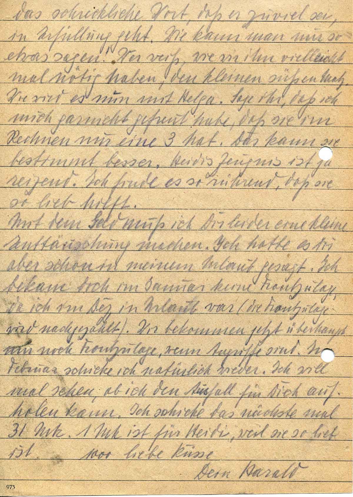 Mit dem Geld muss ich Dir leider eine kleine Enttäuschung machen. Ich hatte es Dir aber schon in meinem Urlaub gesagt. Ich bekam doch im Januar keine Frontzulage, da ich im Dez in Urlaub war. (Die Frontzulage wird nachgezahlt). Wir bekommen jetzt überhaupt nur noch Frontzulage, wenn Angriffe sind. Im Februar schicke ich natürlich wieder. Ich will mal sehen, ob ich den Ausfall für Dich aufholen kann. Ich schicke das nächste mal 31 Mk. 1 Mk ist für Heidi, weil sie so lieb ist.