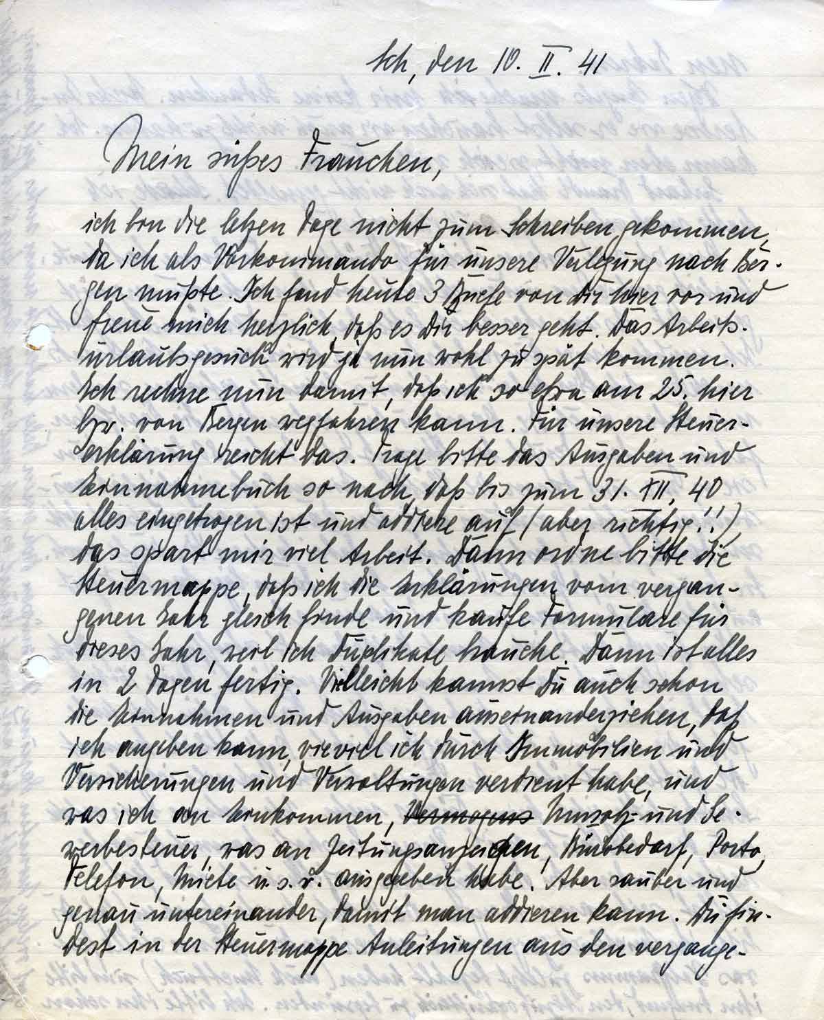 Ich bin die letzten Tage nicht zum Schreiben gekommen, da ich als vor Kommando für unsere Verlegung nach Bergen musste. Ich fand heute 3 Briefe von Dir hier vor und freue mich herzlich, dass es Dir besser geht. Das Arbeitsurlaubsgesuch wird ja nun wohl zu spät kommen. Ich rechne nun damit, dass ich so etwa am 25. hier bzw. von Bergen wegfahren kann. Für unsere Steuererklärung reicht das. Trage bitte das Ausgaben (-) und Einnahmenbuch so nach, dass bis zum 31.XII. 40 alles eingetragen ist und addiere auf (aber richtig!!), Das spart mir viel Arbeit. Dann (unleserlich) bitte die Steuermappe, dass ich die Erklärungen vom vergangenen Jahr gleich finde und kaufe Formulare für dieses Jahr, weil ich Duplikate brauche. Dann ist alles in 2 Tagen fertig. Vielleicht kannst Du auch schon die Einnahmen und Ausgaben auseinanderziehen, dass ich angeben kann, wie viel ich durch Immobilien und Versicherungen und Verwaltungen verdient habe, und was ich an Einkommen, Umsatz-und Gewerbesteuer, was an Zeitungsanzeigen, Bürobedarf, Porto, Telefon, Miete u.s.w. Ausgegeben habe. Aber sauber und genau untereinander, damit man addieren kann. Du findest in der Steuermappe Anleitungen aus den vergange-