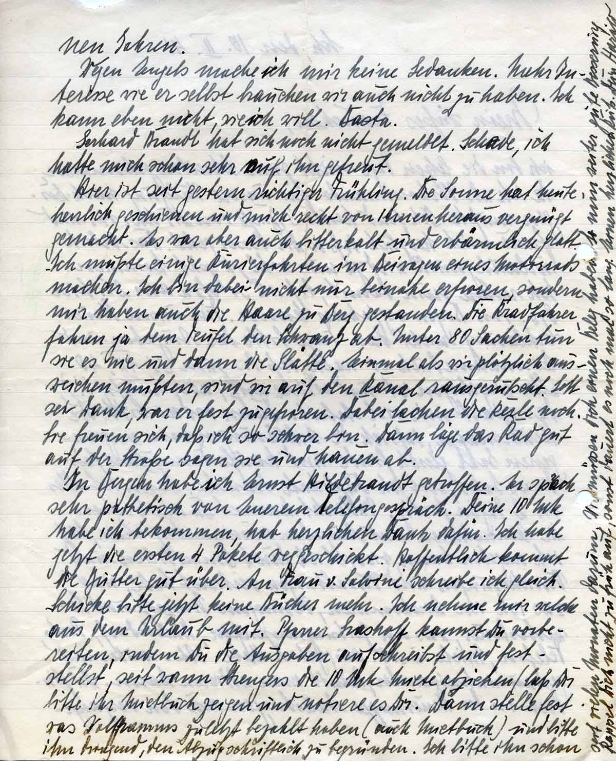 Hier ist seit gestern richtiger Frühling. Die Sonne hat heute herrlich geschienen und mich recht von innen heraus vergnügt gemacht. Es war aber auch bitter kalt und erbärmlich glatt. Ich musste einige Kurierfahrten im Beiwagen eines Motorrads machen. Ich bin dabei nicht nur beinahe erfroren, sondern wir haben auch die Haare zu Berge gestanden. Die Kraftfahrer fahren ja dem Teufel den Schwanz ab. Unter 80 Sachen tun sie es nie und dann die Glätte. Einmal als wir plötzlich ausweichen mussten, sind wir auf den Kanal rausgerutscht. Gott sei Dank, war er fest zugefroren. Dabei lachen die Kerle noch. Sie freuen sich, dass ich so schwer bin. Dann läge das Rad gut auf der Straße, sagen sie und hauen ab..