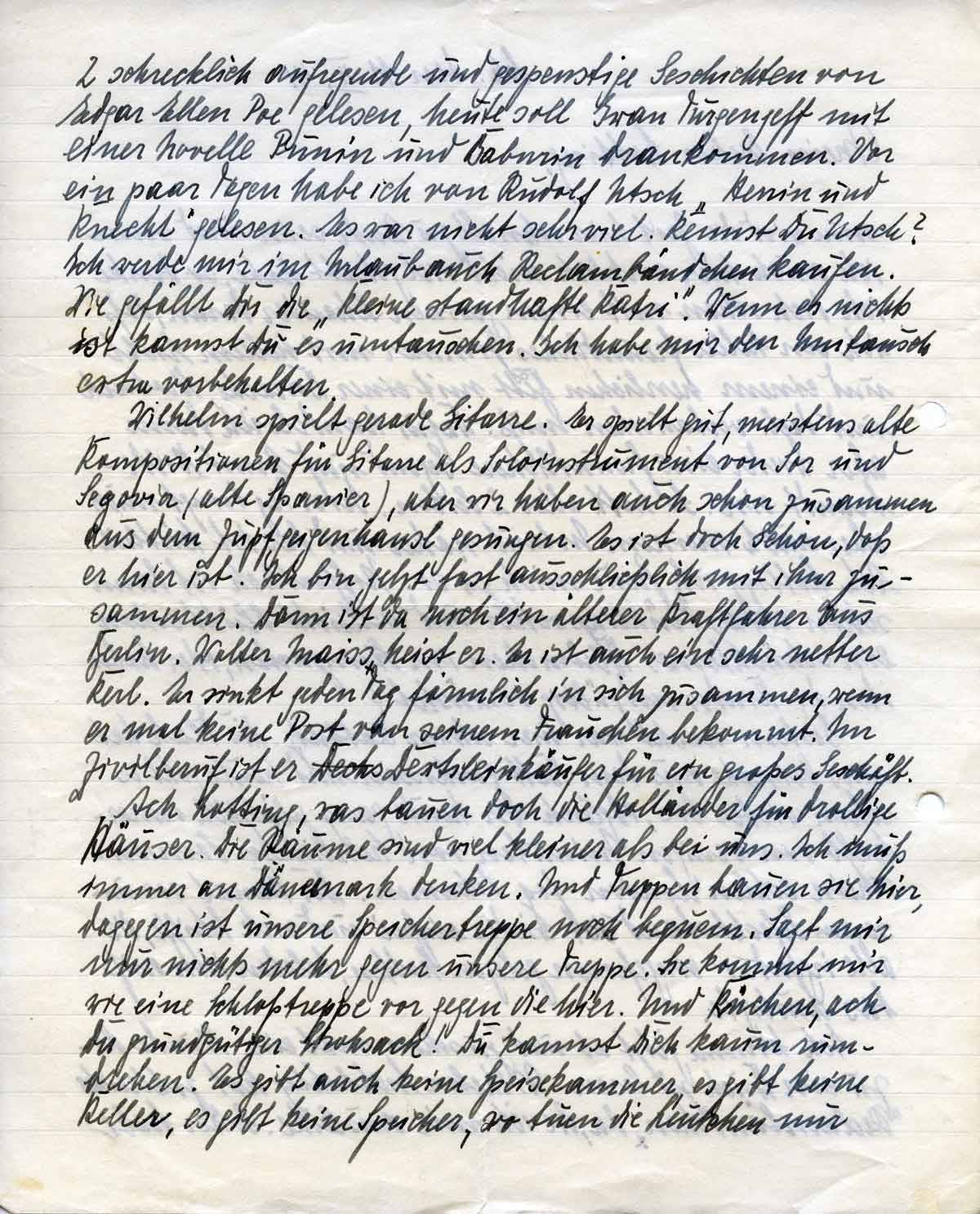 Wilhelm spielt gerade Gitarre. Er spielt gut, meistens alte Kompositionen für Gitarre als Soloinstrument von Sor und Segovia (alte Spanier), aber wir haben auch schon zusammen aus dem Zupfgeigenhansl gesungen. Es ist doch schön, dass er hier ist! Ich bin jetzt fast ausschließlich mit ihm zusammen. Dann ist da noch ein älterer Kraftfahrer aus Berlin. Walter Maiss heist (!) er. Er ist auch ein sehr netter Kerl. Er sinkt jeden Tag förmlich in sich zusammen, wenn er mal keine Post von seinem Frauchen bekommt. Im Zivilberuf ist er (unleserlich) -einkäufer für ein großes Geschäft.
