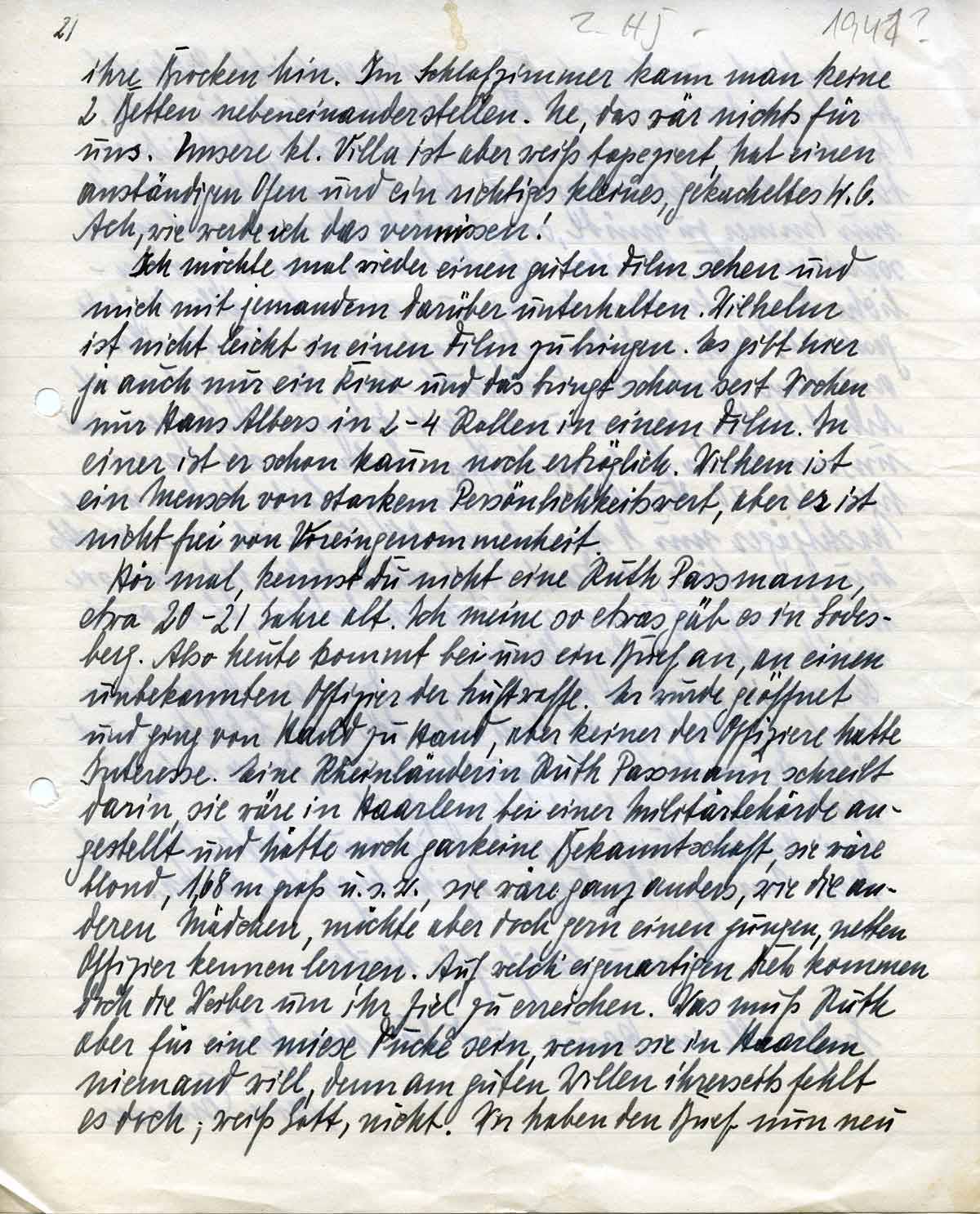 Hör mal, kennst Du nicht eine Ruth Passmann, etwa 20-21 Jahre alt. Ich meine so etwas gäbe es in Godesberg. Aber heute kommt bei uns ein Brief an, an einen unbekannten Offizier der Luftwaffe. Er wurde geöffnet und ging von Hand zu Hand, aber keiner der Offiziere hatte Interesse. Eine Rheinländerin Ruth Passmann schreibt darin, sie wäre in Haarlem bei einer Militärbehörde angestellt und hätte noch garkeine Bekanntschaft, sie wäre blond, 1,68 m hoch u.s.w. , sie wäre ganz anders, wie die anderen Mädchen, möchte aber doch gern einen jungen, netten Offizier kennenlernen. Auf welch eigenartigen Dreh kommen doch die Werber um ihr Ziel zu erreichen. Was muss Ruth aber für eine miese Tucke (?) sein, wenn sie in Haarlem keiner will, denn am guten Willen ihrerseits fehlt es doch, weiß Gott, nicht. Wir haben den Brief nun neu