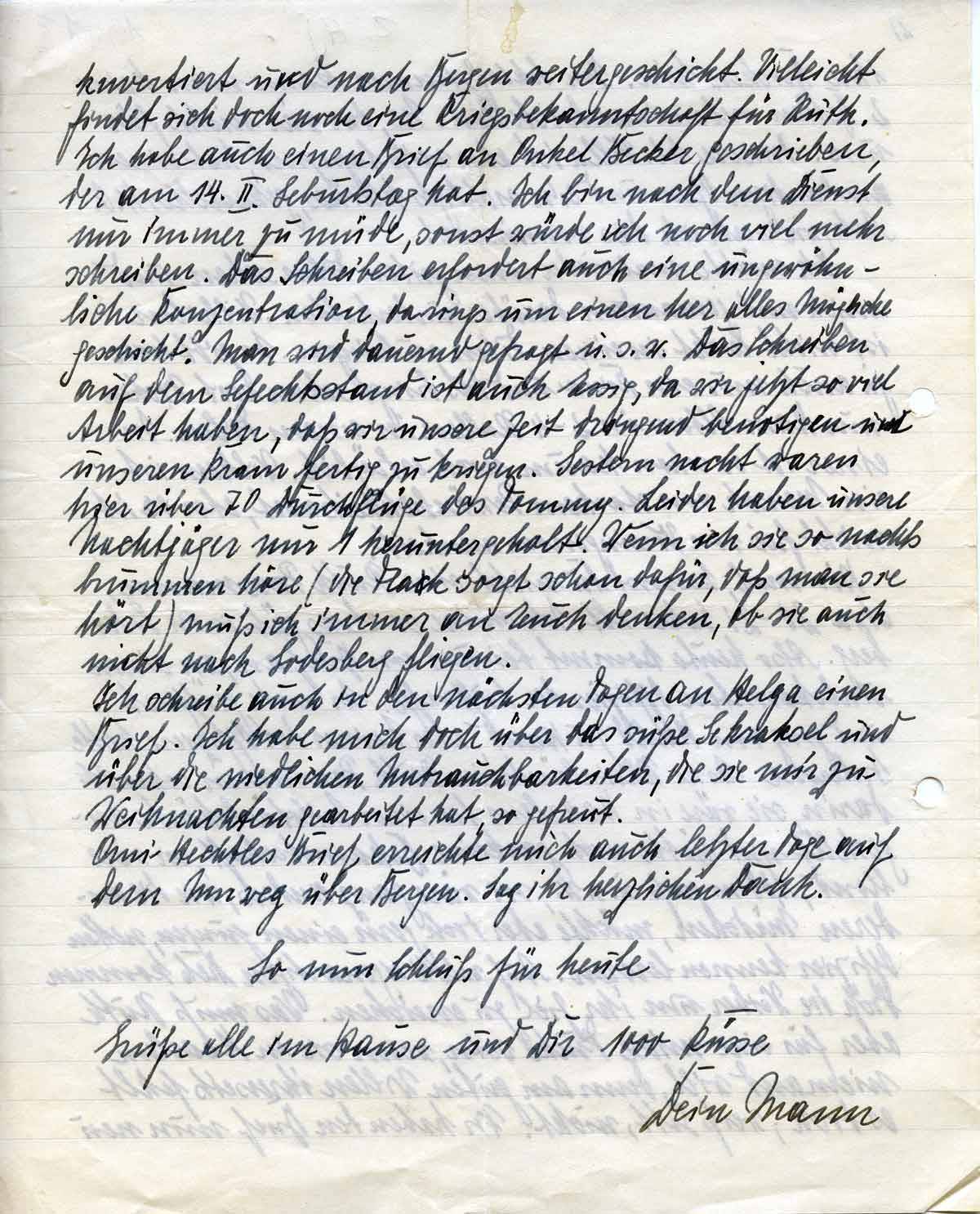 kuvertiert und nach Bergen weitergeschickt. Vielleicht findet sich doch noch eine Kriegsbekanntschaft für Ruth. Ich habe auch einen Brief an Onkel Becker geschrieben, der am 14.II. Geburtstag hat. Ich bin nach dem Dienst nur immer zu müde, sonst würde ich noch viel mehr schreiben. Das Schreiben erfordert auch eine ungewöhnliche Konzentration, da rings um einen her alles Mögliche geschieht. Man wird dauernd gefragt u.s.w. Das Schreiben auf dem Gefechtsstand ist auch Essig, da wir jetzt so viel Arbeit haben, dass wir unsere Zeit dringend benötigen um unseren Kram fertig zu kriegen. Gestern nacht waren hier über 70 Durchflüge des Tommy. Leider haben unsere Nachtjäger nur 1 heruntergeholt wenn ich sie so nachts brummen höre (die Flak sorgt schon dafür, dass man sie hört) muss ich immer an Euch denken, ob sie auch nicht nach Godesberg fliegen.