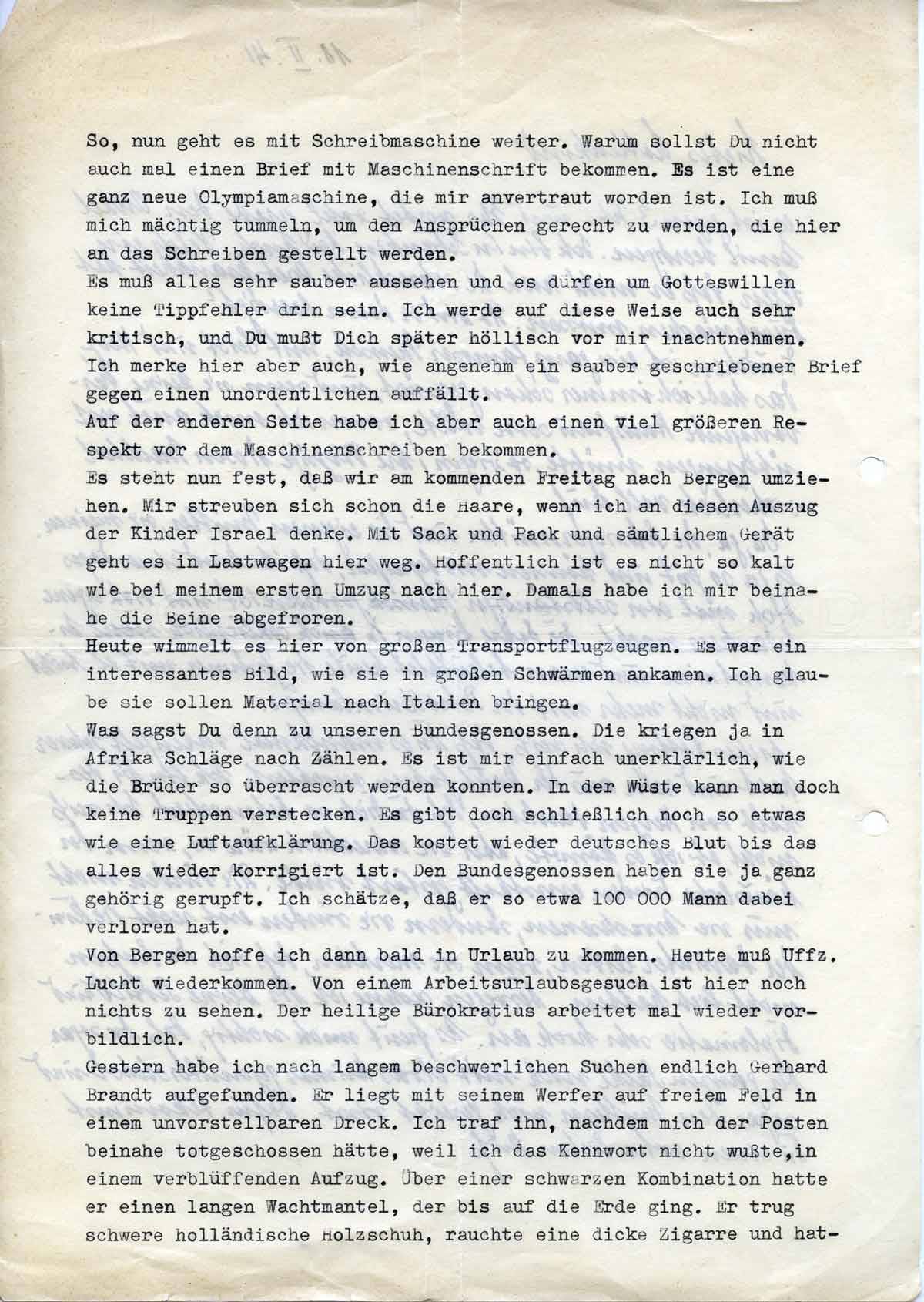 So, nun geht es mit Schreibmaschine weiter. Warum sollst Du nicht auch mal einen Brief mit Maschinenschrift bekommen. Es ist eine ganz neue Olympiamaschine, die mir anvertraut worden ist. Ich muss mich mächtig tummeln, um den Ansprüchen gerecht zu werden, die hier an das Schreiben gestellt werden.