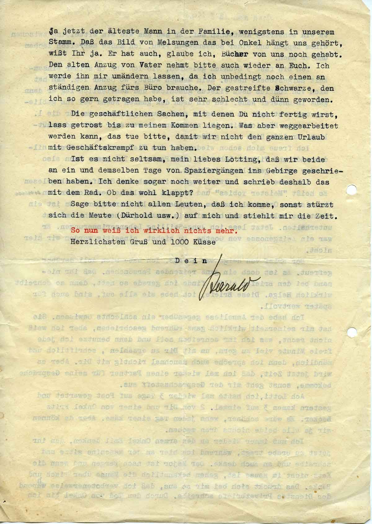 Es muss alles sehr sauber aus sehen und es dürfen um Gotteswillen keine Tippfehler drin sein. Ich werde auf diese Weise auch sehr kritisch, und Du musst Dich später höllisch vor mir inachtnehmen (!) (Harald meint Lottis Tätigkeit als Hilfe in seinem Büro.) Ich merke hier aber auch, wie angenehm ein saubergeschriebener Brief gegen einen unordentlichen auffällt.