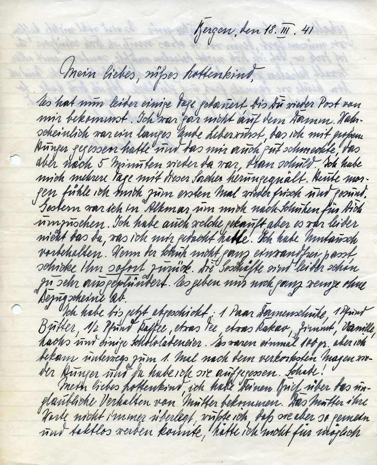 Es hat nun leider einige Tage gedauert, bis Du wieder Post von mir bekommst. Ich war gar nicht auf dem Damm. Wahrscheinlich war ein langes Ende Leberwurst, dass ich mit großem Hunger gegessen hatte und das mir auch gut schmeckte, das aber nach 5 Minuten wieder da war, dran schuld. Ich habe mich mehrere Tage mit dieser Sache herum gequält. Heute morgen fühle ich mich zum ersten Mal wieder frisch und gesund. Gestern war ich in Alkmar, um mich nach Schuhen für Dich um zu sehen. Ich habe auch welche gekauft aber es war leider nicht das da was ich mir gedacht hatte. Ich habe Umtausch vorbehalten. Wenn der Schuh nicht ganz einwandfrei passt, schicke ihn sofort zurück. Die Geschäfte sind leider schon zu sehr ausgeplündert. Es geben nur noch ganz wenige ohne Bezugsscheine ab.