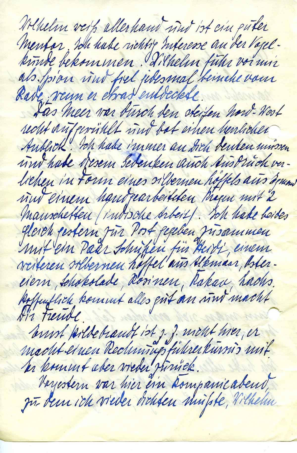 Das Meer war durch den steifen Nord-West recht aufgerüttelt und bot einen herrlichen Anblick. Ich habe immer an Dich denken müssen und habe diesem Gedenken auch Ausdruck verliehen in Form eines silbernen Löffels aus Egmond und einem handgearbeiteten Kragen mit 2 Manschetten (indische Arbeit). Ich habe beides gleich gestern zur Post gegeben zusammen mit ein Paar Schuhen für Heidi, einem weiteren silbernen Löffel aus Alkmaar, Ostereiern, Schokolade, Rosinen, Kakao, Lachs. Hoffentlich kommt alles gut an und macht Dir Freude.