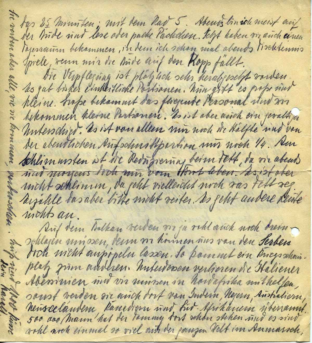 Auf dem Balkan werden wir ja wohl auch noch dreinschlagen müssen, denn wir können uns von den Serben doch nicht anpöpeln (!) lassen. So kommt ein Kriegsschauplatz zum anderen. Unterdessen verlieren die Italiener Abessinien und wir müssen in Nordafrika mithelfen, sonst werden sie auch dort von Indern, Negern, Australiern, Neuseeländern, Kanadiern und Süd- Afrikanern überrannt.