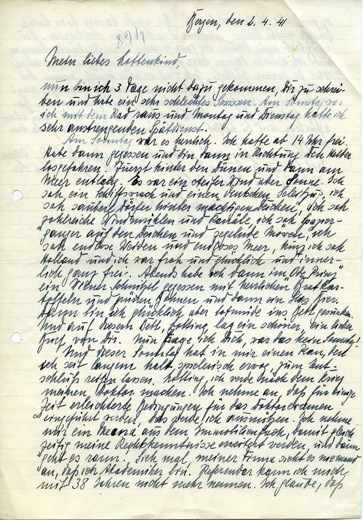 Am Sonntag war es herrlich. Ich hatte ab 14 Uhr frei. Habe dann gegessen und bin dann in Richtung den Halden (???) losgefahren. Zuerst hinter den Dünen und dann am Meer entlang. Es war ein steifer Wind aber Sonne. Ich sah ein Schiffswrack mit einem deutschen Geleitszug, Ich sah saubere Dörfer hinter mächtigen Deichen, ich sah zahlreiche Windmühlen und Kanäle, ich sah Spaziergänger auf den Deichen und segelnde Möwen, ich sah endlose Weiden und endloses Meer, kurz ich sah Holland und ich war froh und glücklich und innerlich ganz frei. Abends habe ich dann im „Ode Prinz“ ein Wiener Schnitzel gegessen mit herrlichen Bratkartoffeln und grünen Bohnen und dann ein Glas Bier. Dann bin ich glücklich, aber todmüde ins Bett gesunken. Und auf diesem Bett, Lotting, lag ein schöner, ein lieber Brief von Dir. Nun frage ich Dich, war das kein Sonntag?