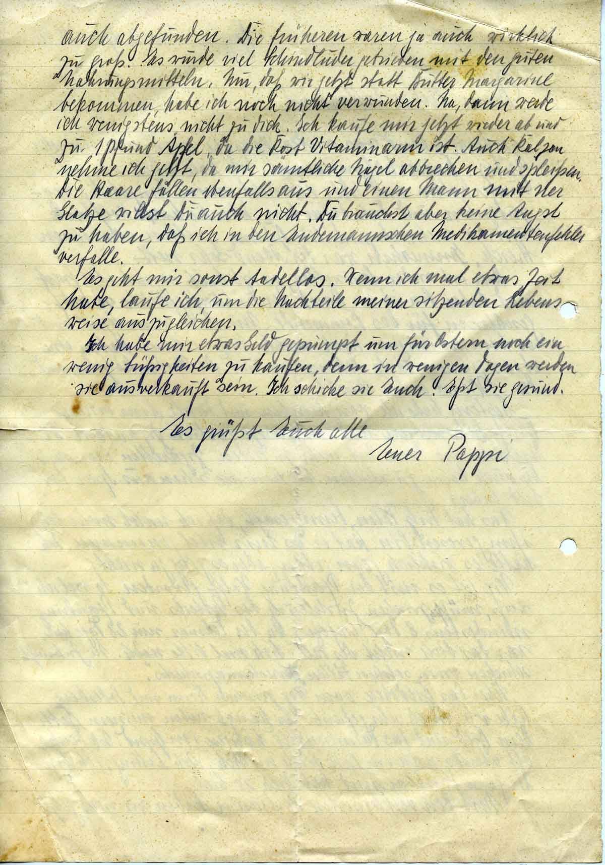 auch abgefunden. Die früheren waren ja auch wirklich zu groß. Es wurde viel Schindluder getrieben mit den guten Nahrungsmitteln. Nur, dass wir jetzt statt Butter Margarine bekommen, habe ich noch nicht verwunden. Na, dann werde ich wenigstens nicht zu dick. Ich kaufe mir jetzt wieder ab und zu 1 Pfund Äpfel , da die Kost Vitaminarm ist. Auch Kalzon (?) (=Kalzium?) nehme ich jetzt, da mir sämtliche Nägel abbrechen und schleifen. Die Haare fallen ebenfalls aus und einen Mann mit ner Glatze willst Du auch nicht du brauchst aber keine Angst zu haben, dass ich in den Endemannschen Medikamentenfehler verfalle.