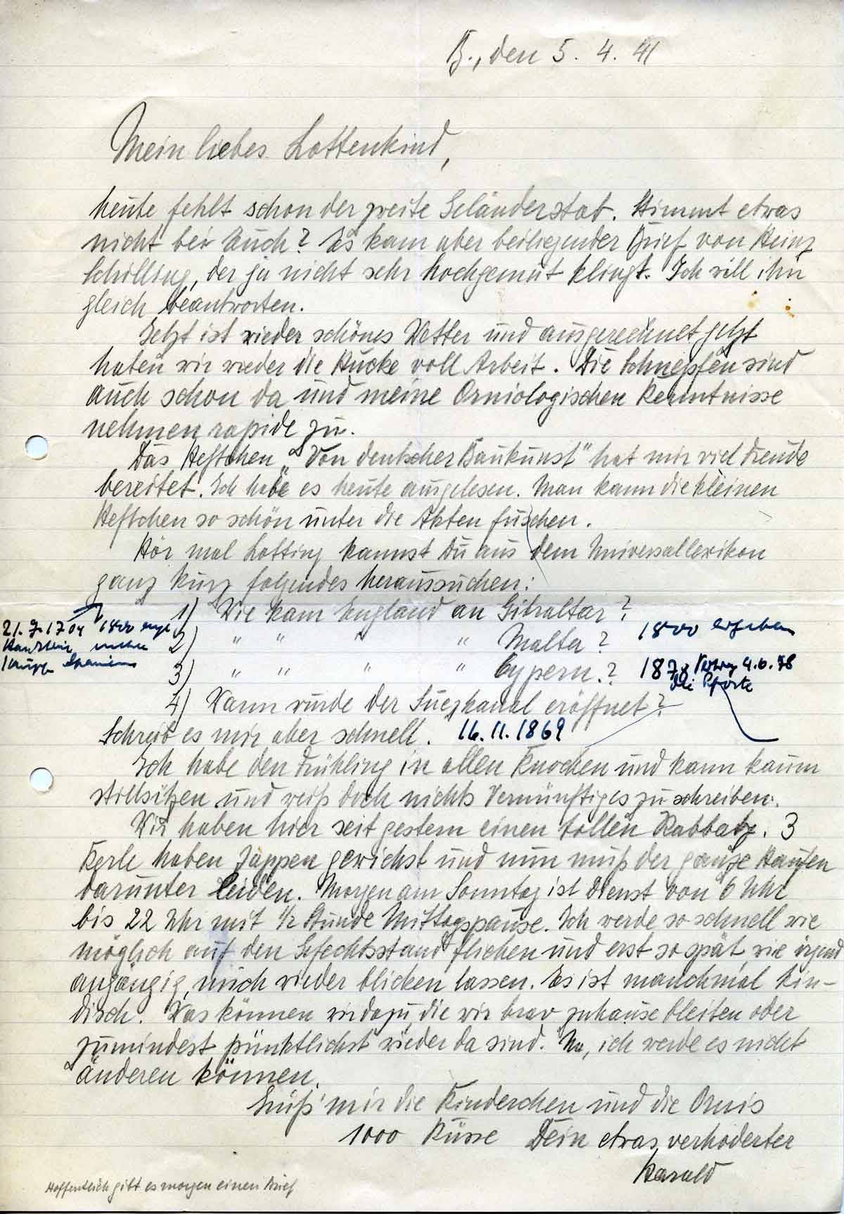 Harald Endemann an seine Frau Charlotte, 5. April 1941