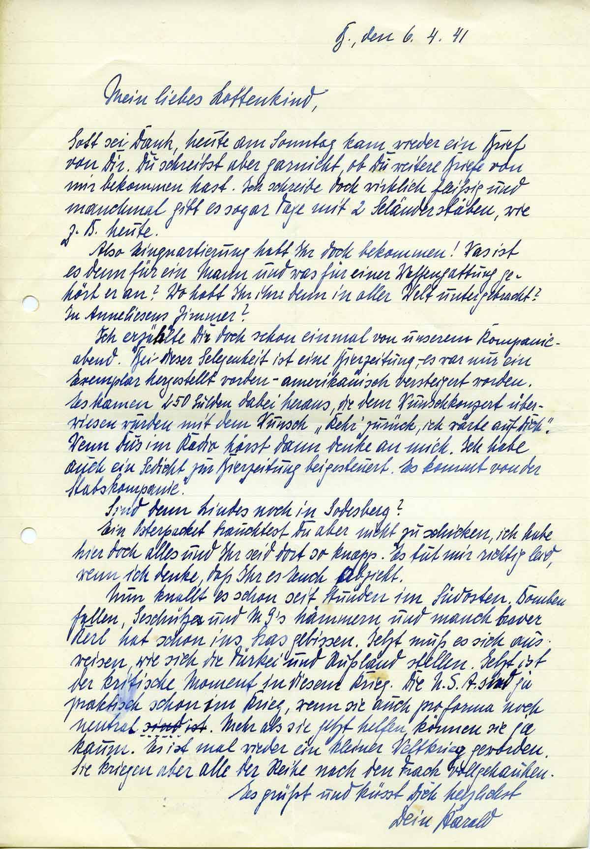 Harald Endemann an seine Frau Charlotte, 6. April 1941