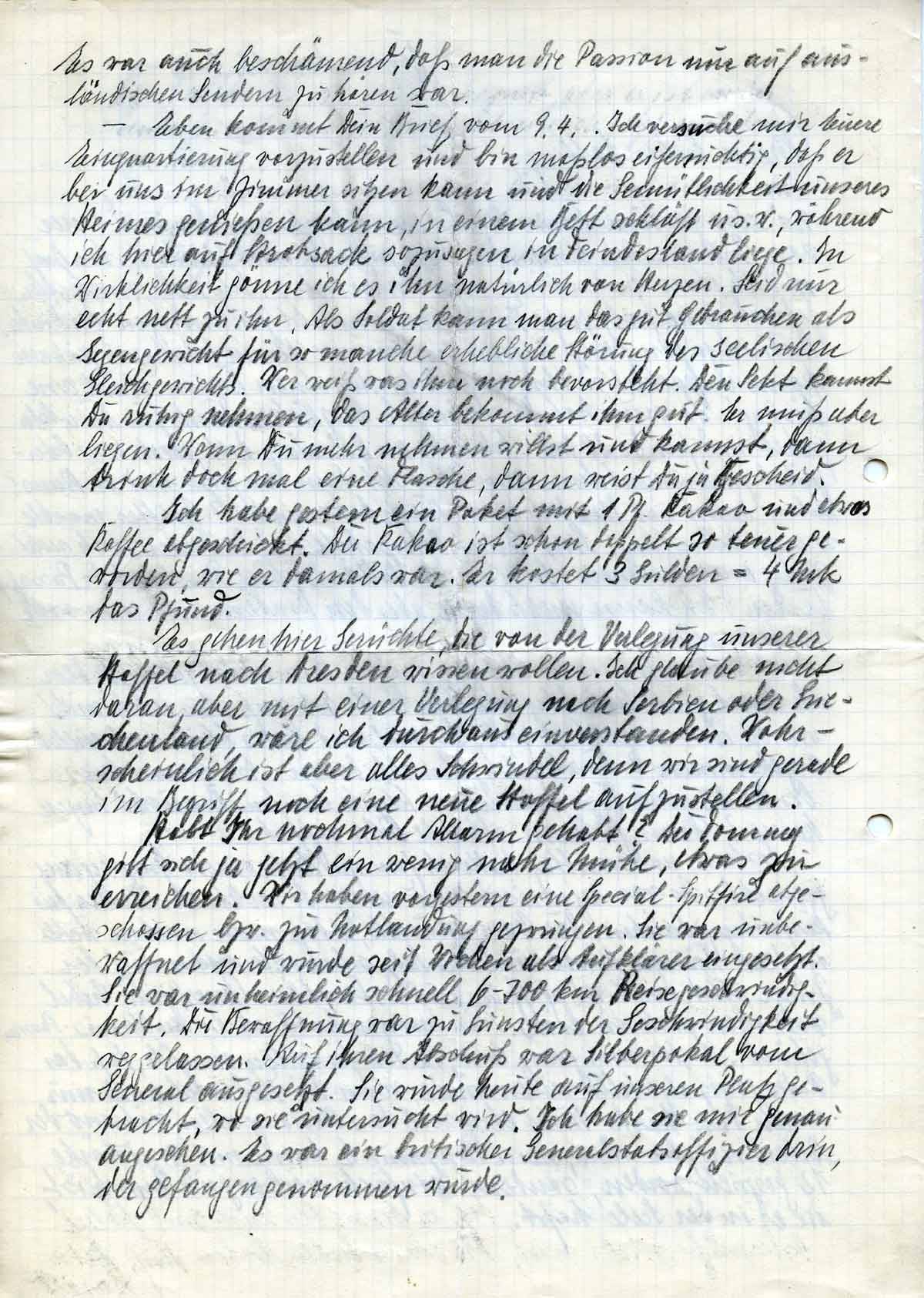 Habt ihr nochmal Alarm gehabt? Der Tommy gibt sich ja jetzt ein wenig mehr Mühe, etwas zu erreichen. Wir haben vorgestern eine Special- Spitfire abgeschossen bzw. zur Notlandung gezwungen. Sie war unbewaffnet und wurde seit Wochen als Aufklärer eingesetzt. Sie war unheimlich schnell 6-700 km Reisegeschwindigkeit. Die Bewaffnung war zu Gunsten der Geschwindigkeit weggelassen. Auf ihren Abschuß war Silberpokal vom General ausgesetzt. Sie wurde heute auf unseren Platz gebracht, wo sie untersucht wird. Ich habe sie mir genau angesehen. Es war ein britischer Generalstabsoffiziere drin, der gefangen genommen wurde.