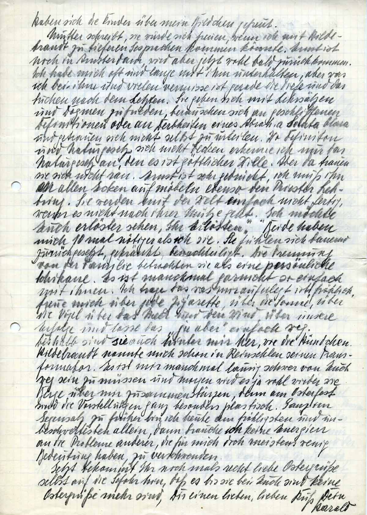 Na also gestern kam der Segen 3 Briefe von Dir und einer von Mutter. Ich bin wieder sehr zufrieden und beruhigt. Ein Brief ist doch etwas Wunderschönes und nun erst 4. ich habe mich sehr gefreut. Eine ganz große Freude waren mir die Zeichnungen der Kinder. Heidi ist ja ein ganz Rafiniertes (!). Wenn sie keinen Osterhasen zeichnen kann, verfrachtet sie ihn einfach hinter einen Baum. Auch eine Lösung! So nun hab Du nochmals herzlichen Dank für Dein Osterpaket und für die 30 Mk. Ich habe an Kläuschen doch noch ein Osterpaket zusammen bekommen. Wo steckt denn Thea jetzt und wo Hans? Haben Hansi und Thea doch noch Krach bekommen? Mutter machte so eine Andeutung. Sind Eure Osterpakete und die Karten noch rechtzeitig angekommen. So sind die Holländischen Paachfest (?) (Passah)-Karten. Ich kann nichts dafür aber den Kindern werden sie wohl Freude machen.