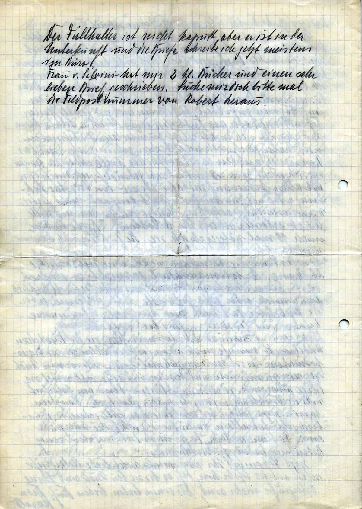 Es war auch beschämend, daß (man) die Passion nur auf ausländischen Sendern zu hören war. - Eben kommt Dein Brief vom 9. 4. Ich versuche mir diese Einquartierung vorzustellen und bin maßlos eifersüchtig, daß er bei uns im Zimmer sitzen kann und die Gemütlichkeit unseres Heimes genießen kann, in einem Bett schläft usw., während ich hier auf Strohsack sozusagen in Feindesland liege. In Wirklichkeit gönne ich es ihm natürlich von Herzen. Seit nur echt nett zu ihm. Als Soldat kann man das gut gebrauchen als Gegengewicht für so mancher schreckliche Störung des seelischen Gleichgewichts. Wer weiß was ihn noch bevorsteht. (Anm.: Herr Schüler tatsächlich im Winter 1941/42 offenbar vor Moskau verschollen.) Den Sekt kannst du ruhig nehmen, das alles bekommt ihm gut. Er muss aber liegen. Wenn Du mehr nehmen willst und kannst, dann trink doch mal eine Flasche, dann weist Du ja Bescheid.