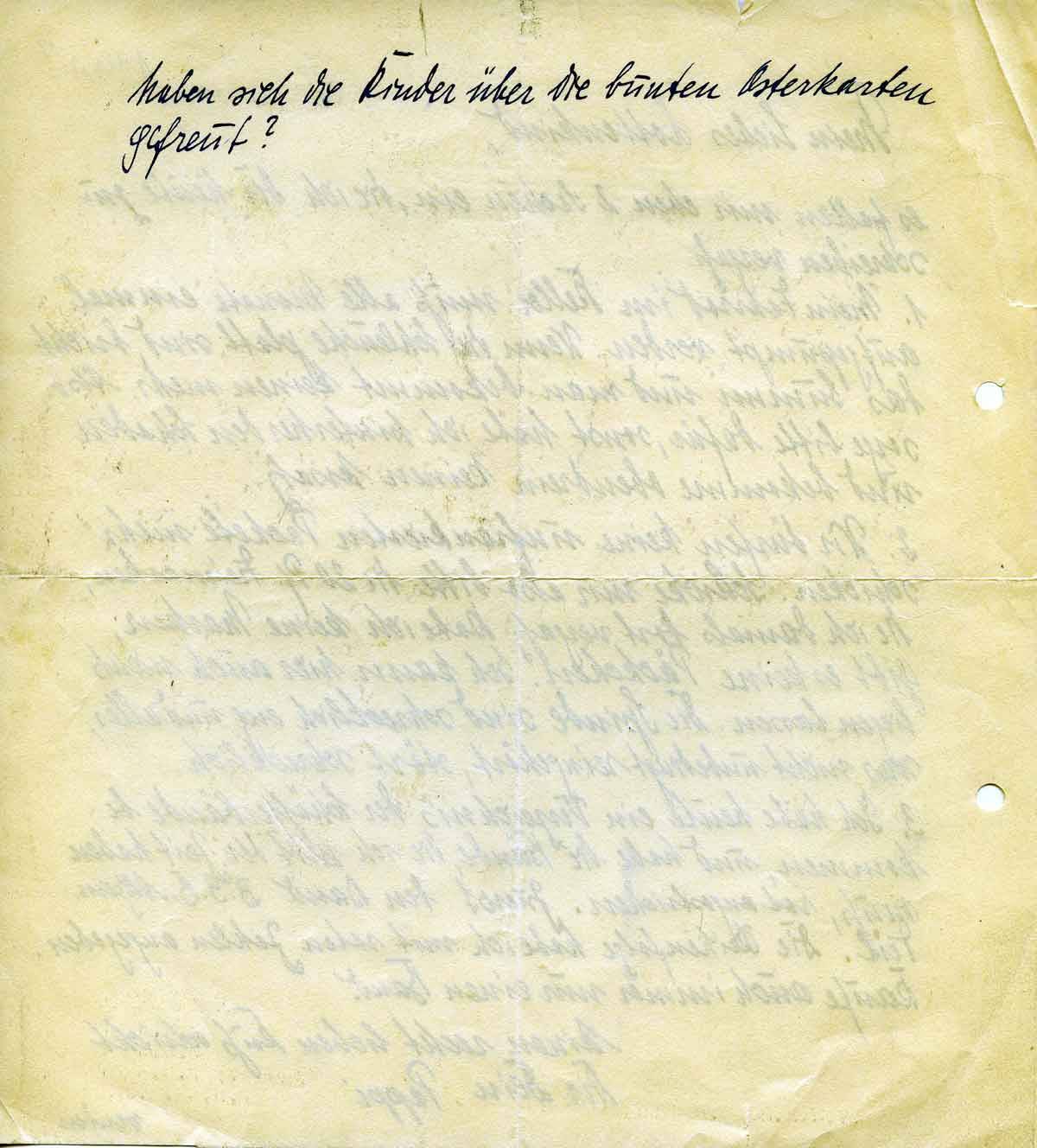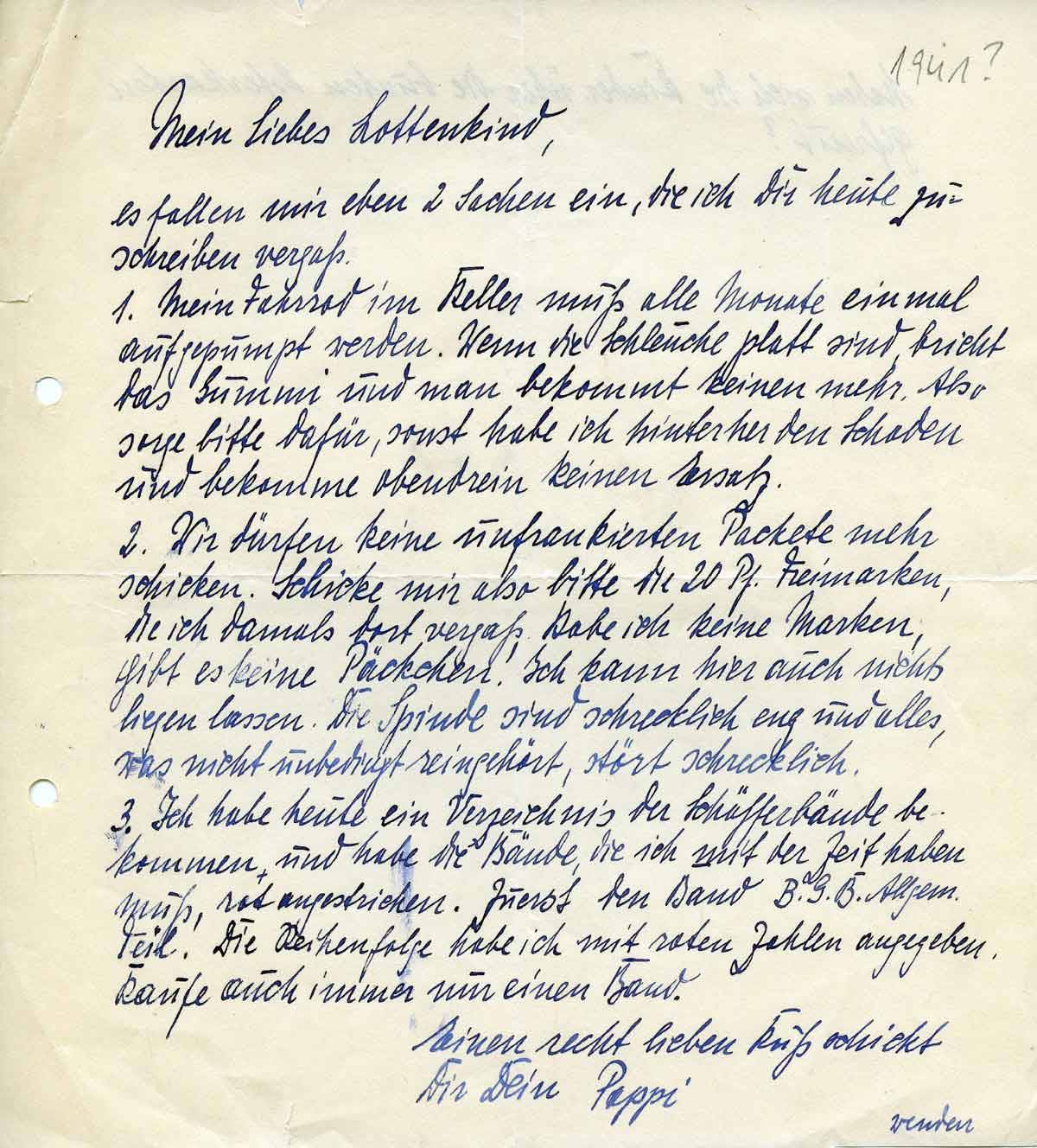 2.) Wir dürfen keine unfrankierten Pakete mehr schicken. Schicke mir aber bitte die 20 Pf. Freimarken, die ich damals fast vergaß. Habe ich keine Marken, gibt es keine Päckchen. Ich kann hier auch nichts liegen lassen. Die Spinde sind schrecklich und alles was nicht unbedingt reingehört, stört schrecklich. Drittens