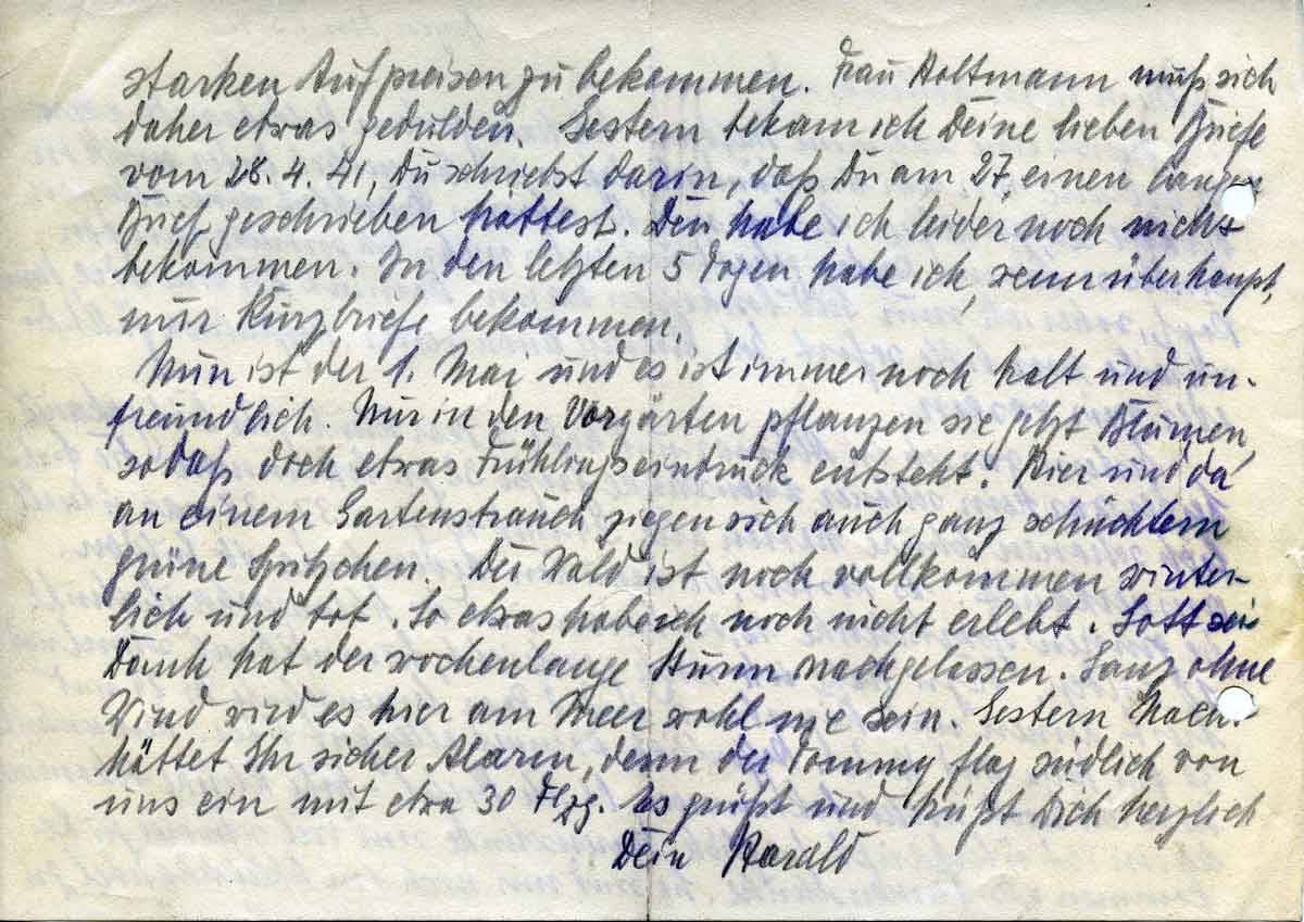 Nun ist der 1. Mai, und es ist immer noch kalt und unfreundlich. Nur in den Vorgärten pflanzen sie jetzt Blumen, sodaß doch etwas Frühlingseindruck entsteht. Hier und da an einem Gartenstrauch zeigen sich auch ganz schüchtern grünen Spitzchen. Der Wald ist noch vollkommen winterlich und tot. So etwas habe ich noch nicht erlebt. Gott sei Dank hat der wochenlange Sturm nachgelassen. Ganz ohne Wind wird es hier am Meer wohl nie sein. Gestern (unleserlich??) hättet Ihr sicher Alarm, denn der Tommy flog südlich von uns ein mit etwa 30 Flzg. Es grüßt und küßt Dich herzlich Dein Harald