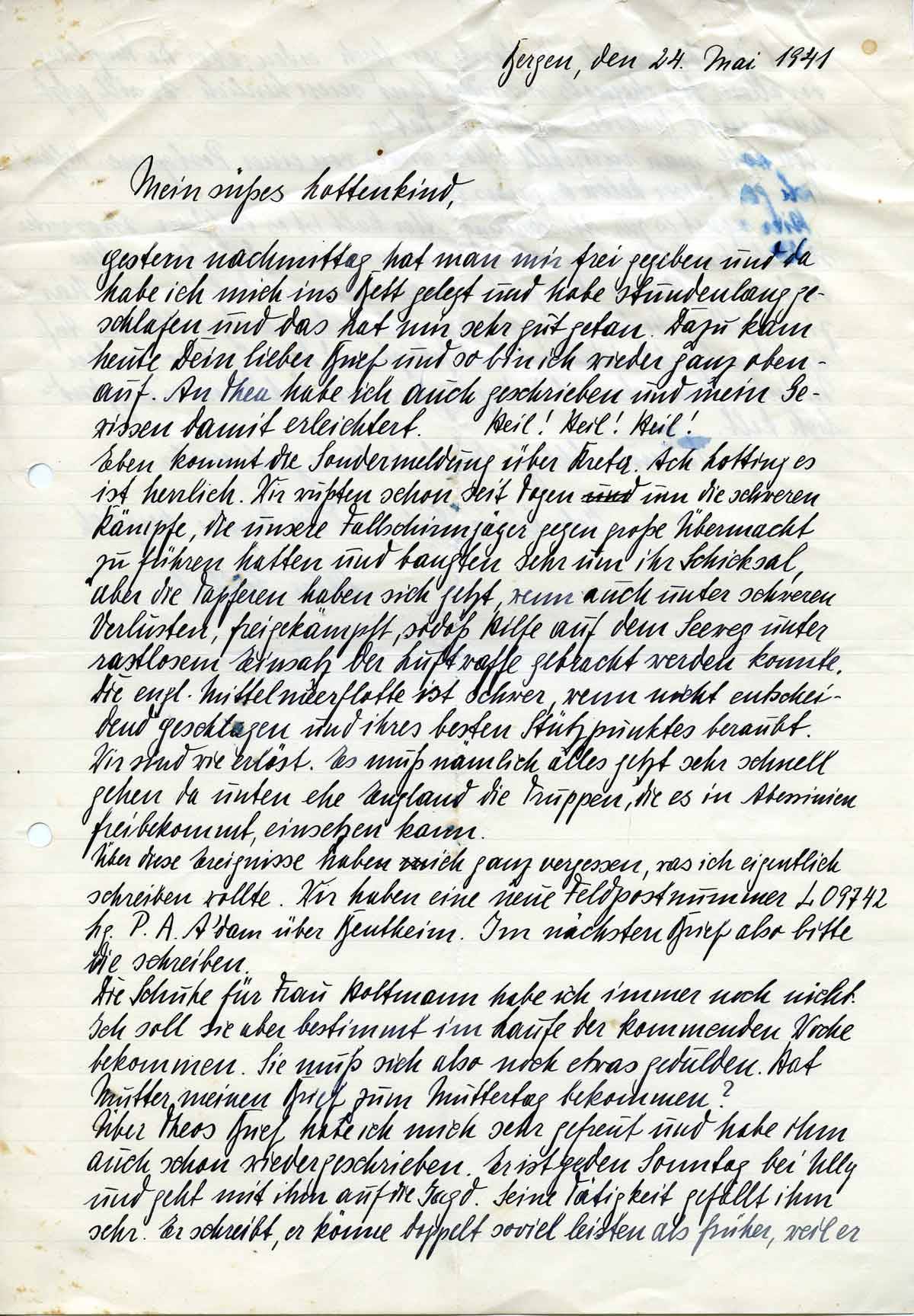Eben kommt die Sondermeldung über Kreta. Ach Lotting es ist herrlich. Wir wußten schon seit Tagen um die schweren Kämpfe, die unsere Fallschirmjäger gegen große Übermacht zu führen hatten und bangten sehr um ihr Schicksal aber die Tapferen haben sich jetzt, wenn auch unter schweren Verlusten, frei gekämpft, sodaß Hilfe auf dem Seeweg unter rastlosem Einsatz der Luftwaffe gebracht werden konnte. Die engl. Mittelmeerflotte ist schwer, wenn nicht entscheidend geschlagen und ihres besten Stützpunktes beraubt. Wir sind wie erlöst. Es muß nämlich alles jetzt sehr schnell gehen da unten eher England die Truppen, die es in Abessinien frei bekommt, einsetzen kann.