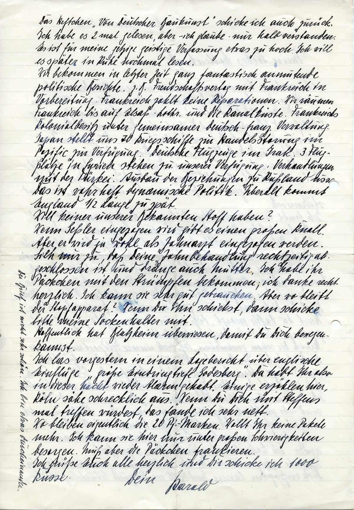 Wenn Geßler eingezogen wird gibt es einen großen Knall. (Ahnt Harald hier etwas?) Aber er wird ja wohl als Zahnarzt eingezogen werden. Sie nur zu, daß Deine Zahnbehandlung rechtzeitig abgeschlossen ist und dränge auch Mutter. Ich habe ihr Päckchen mit den Strümpfen bekommen; ich danke recht herzlich. Ich kann sie sehr gut gebrauchen. Aber wo bleibt der Stoffapparat? Wenn Du ihn schickst, dann schicke bitte meine Sockenhalter mit.