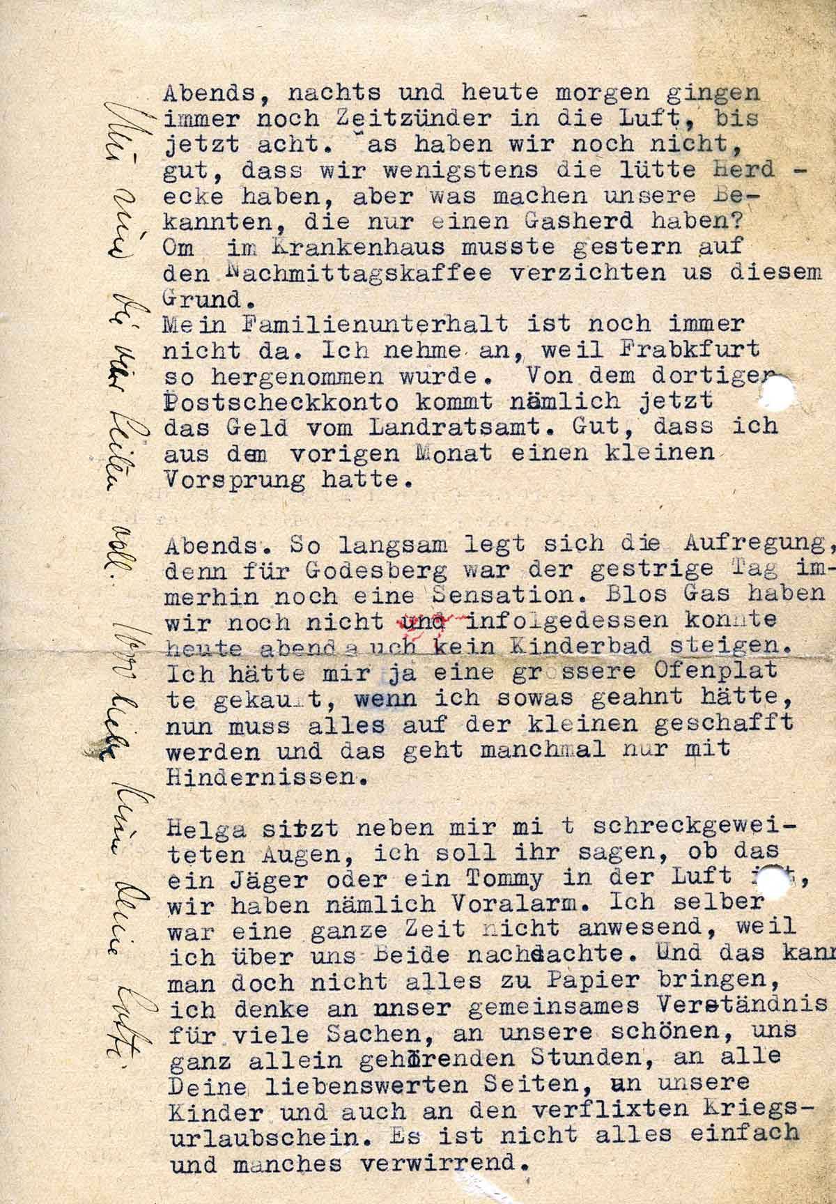 Helga sitzt neben mir mit schreckgeweiteten Augen, ich soll ihr sagen, ob das ein deutscher Jäger oder ein Amerikaner in der Luft ist. Wir haben nämlich Voralarm. Ich selber war eine ganze Zeit nicht anwesend, weil ich über uns beide nachdachte. Und das kann man doch nicht alles zu Papier bringen. Ich dachte an unser gemeinsames Verständnis für viele Sachen, an unsere schönen, uns allein gehörenden Stunden, an alle Deine liebenswerten Seiten, an unsere Kinder und an den verflixten Kriegsurlaubsschein. Es ist nicht alles einfach, und manches verwirrend.