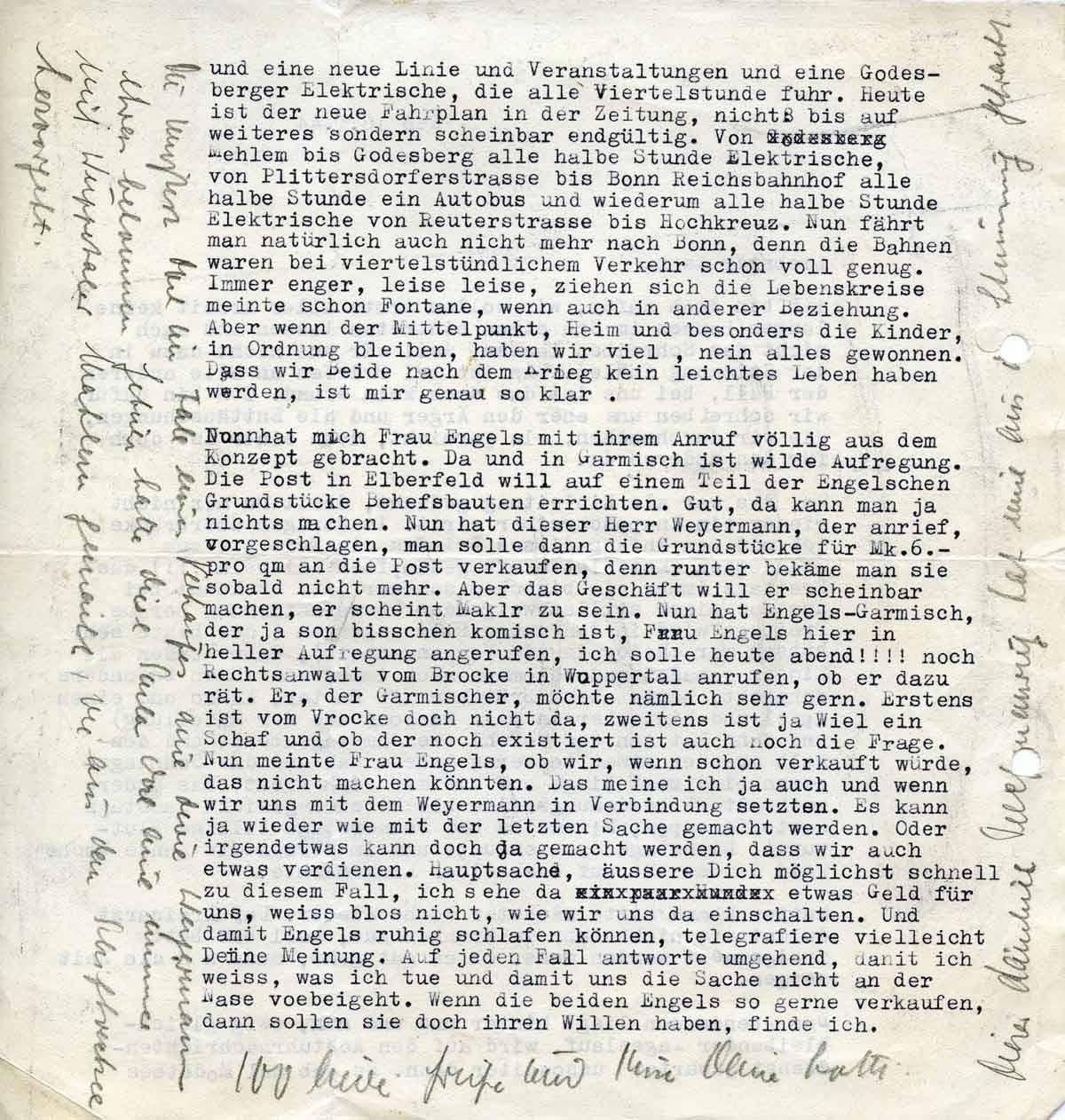 Nun hat mich Frau Engels mit ihrem Anruf völlig aus dem Konzept gebracht. Da und in Garmisch ist wilde Aufregung. Die Post in Elberfeld will auf einem Teil der Engelschen Grundstücke Behelfsbauten errichten. Gut, da kann man ja nichts machen. Nun hat dieser Herr Weyermann, der anrief, vorgeschlagne, man solle dann die Grundstücke für Mk. 6.- pro qm an die Post verkaufen, denn runter bekäme man sie sobald nicht mehr. Aber das Geschäft will er scheinbar machen, er scheint Makler zu sein. Nun hat Engels-Garmisch, der ja son bisschen komisch ist, Frau Engels hier in heller Aufregung angerufen, ich solle heute abend!!!! noch Rechtsanwalt vom Brocke in Wuppertal anrufen, ob er dazu rät. Er, der Garmischer, möchte nämlich sehr gern. Erstens ist vom Brocke doch nicht da, zweitens ist ja Weil ein Schaf und ob der noch existiert ist auch noch die Frage. Nun meinte Frau Engels, ob wir, wenn schon verkauft würde, das nicht machen könnten. Das meine ich ja auch und wenn wir uns mit dem Weyermann in Verbindung setzen. Es kann ja wieder wie mit der letzten Sache gemacht werden. Oder irgendetwas kann doch da gemacht werden, dass wir auch etwas verdienen. Hauptsache, äussere Dich möglichst schnell zu diesem Fall. Ich sehe da etwas Geld für uns, weiss blos nicht, wie wir uns da einschalten. Und damit Engels ruhig schlafen können, telegrafiere vielleicht Deine Meinung. Auf jeden Fall antworte umgehend, damit ich weiss, was ich tue und damit uns die Sache nicht an der Nase vorbeigeht. Wenn die beiden Engels so gerne verkaufen, dann sollen sie doch ihre Willen haben, finde ich.