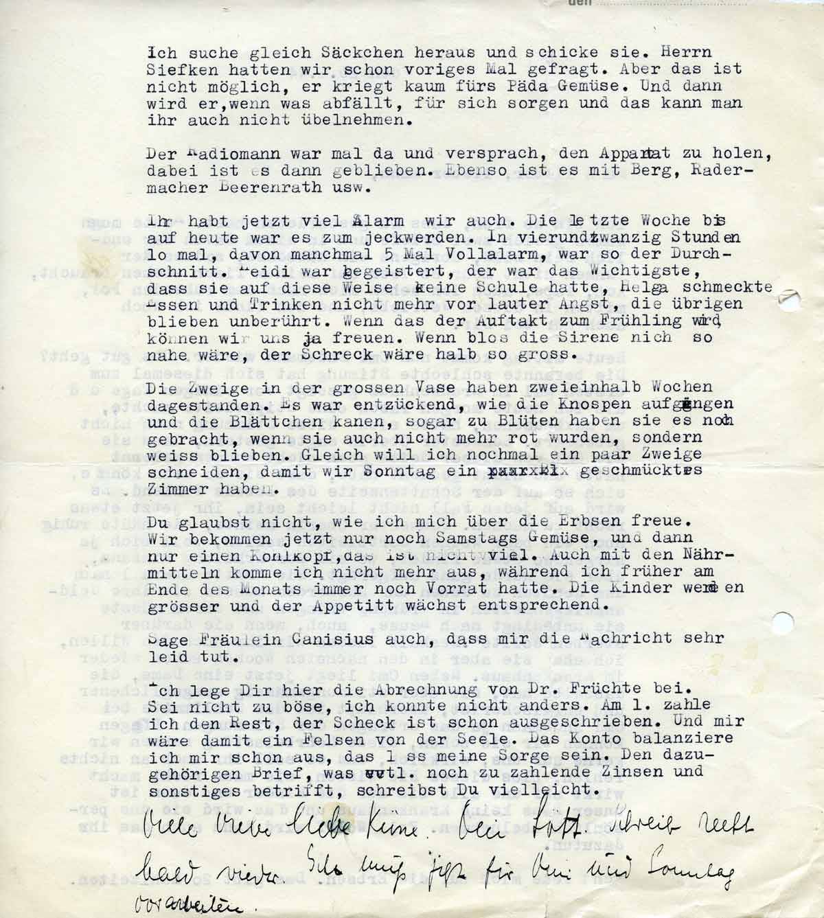 Ihr habt jetzt viel Alarm, wir auch. Die letzte Woche bis auf heute war es zum Jeckwerden. In vierundzwanzig Stunden 10 Mal, davon manchmal 5 Mal Vollalarm. Das war so der Durchschnitt. - Heidi war begeistert. Der war das Wichtigste, dass sie auf diese Weise keine Schule hatte, Helga schmeckte Essen und Trinken nicht mehr vor lauter Angst, die übrigen blieben unberührt. Wenn das der Auftakt zum Frühling wird, können wir uns ja freuen. Wenn bloß die Sirene nicht so nahe wäre, der Schreck wäre halb so groß.
