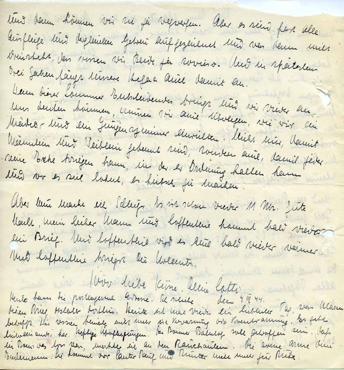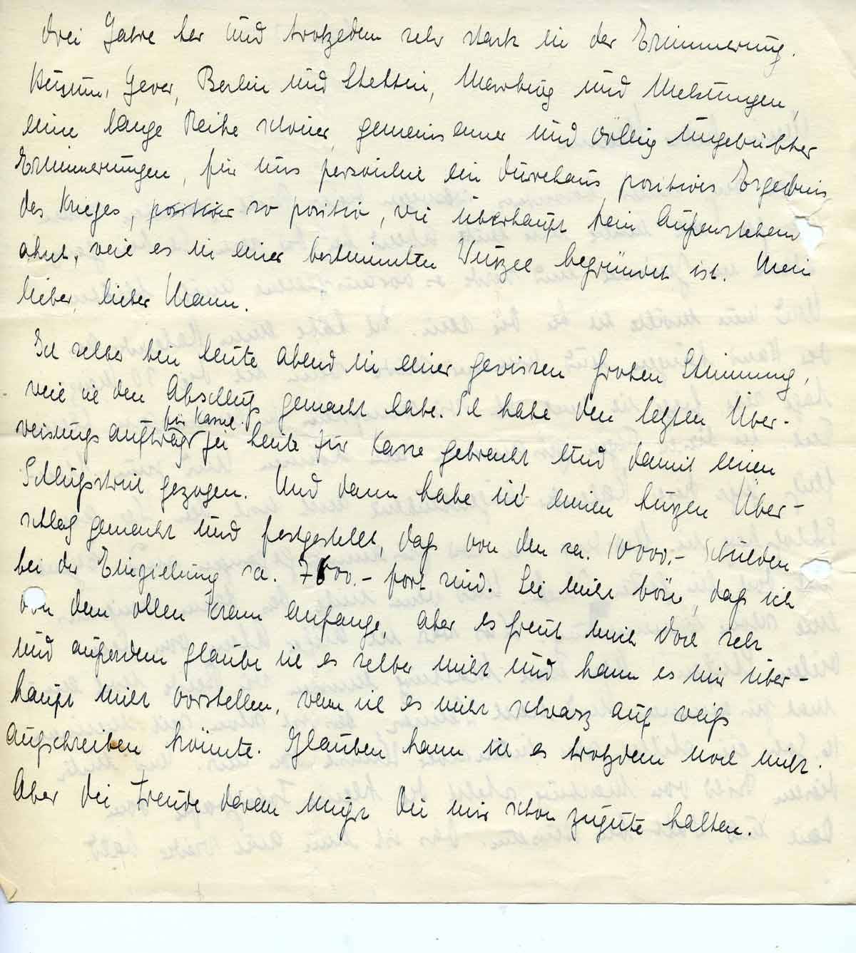 Und dann glaube ich auch, dass wir beide nach dem Krieg uns schon wieder unsere Existenz neu schaffen werden. Vielleicht sind wir näher an unserem gemeinsamen Leben, als wir beide ahnen. Es wird auch Zeit, dass der Pappi nicht nur als Besuch seine Kinder erlebt. Nicht wegen der strengen Erziehung meine ich jetzt, sondern in Freude.