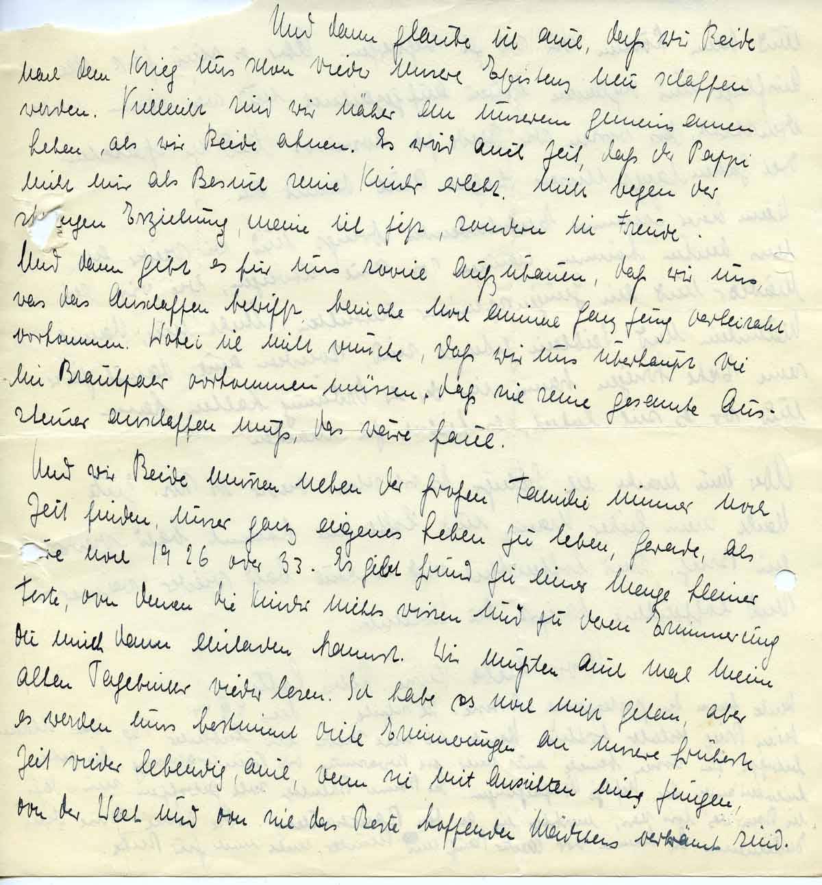 Und wir beide müssen neben der großen Familie immer noch Zeit finden, unser ganz eigenes Leben zu leben, gerade, als wäre noch 1926 oder 33. Es gibt Grund genug zu einer Menge kleiner Feste, von denen die Kinder nichts wissen und zu deren Erinnerung Du mich einladen kannst.