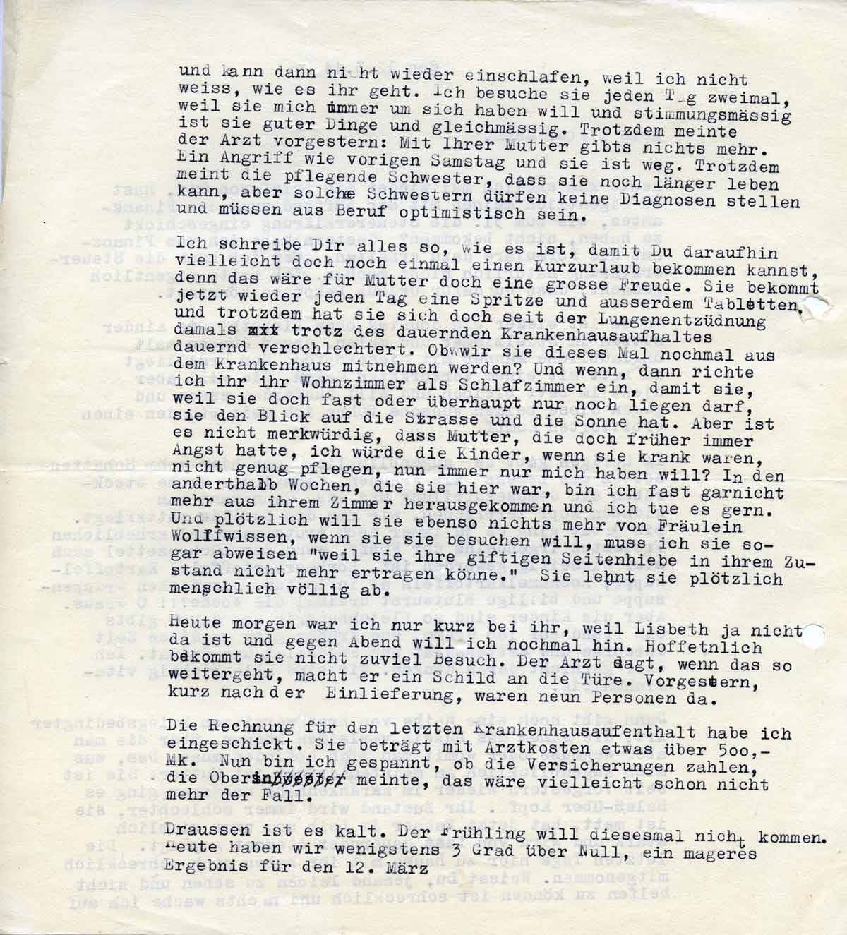 Ich schreibe Dir alles so, wie es ist, damit Du daraufhin vielleicht doch noch einmal einen Kurzurlaub bekommst, denn das wäre für die Mutter doch eine große Freude. Sie bekommt jetzt wieder jeden Tag eine Spritze und außerdem Tabletten, und trotzdem hat sie sich doch seit der Lungenentzündung damals trotz des dauernden Krankenhausaufenthaltes dauernd verschlechtert. Ob wir sie diesmal noch aus dem Krankenhaus mitnehmen werden? Und wenn, dann richte ich ihr das Wohnzimmer als Schlafzimmer ein, damit sie doch, weil sie fast oder überhaupt nur noch liegen darf, sie den Blick auf die Straße und die Sonne hat. Aber ist es nicht merkwürdig, dass Mutter, die doch früher immer Angst hatte, ich würde die Kinder, wenn sie krank waren, nicht genug pflegen, nun immer nur mich um sich haben will? In den anderthalb Wochen, die sie hier war, bin ich fast gar nicht mehr aus ihrem Zimmer herausgekommen, und ich tue es gern. Und plötzlich will sie nichts mehr von Fräulein Wolf wissen, wenn die sie besuchen will, muss ich sie sogar abweisen 'weil sie ihre giftigen Seitenhiebe in ihrem Zustand nicht mehr ertragen kann'. Sie lehnt sie plötzlich völlig ab.