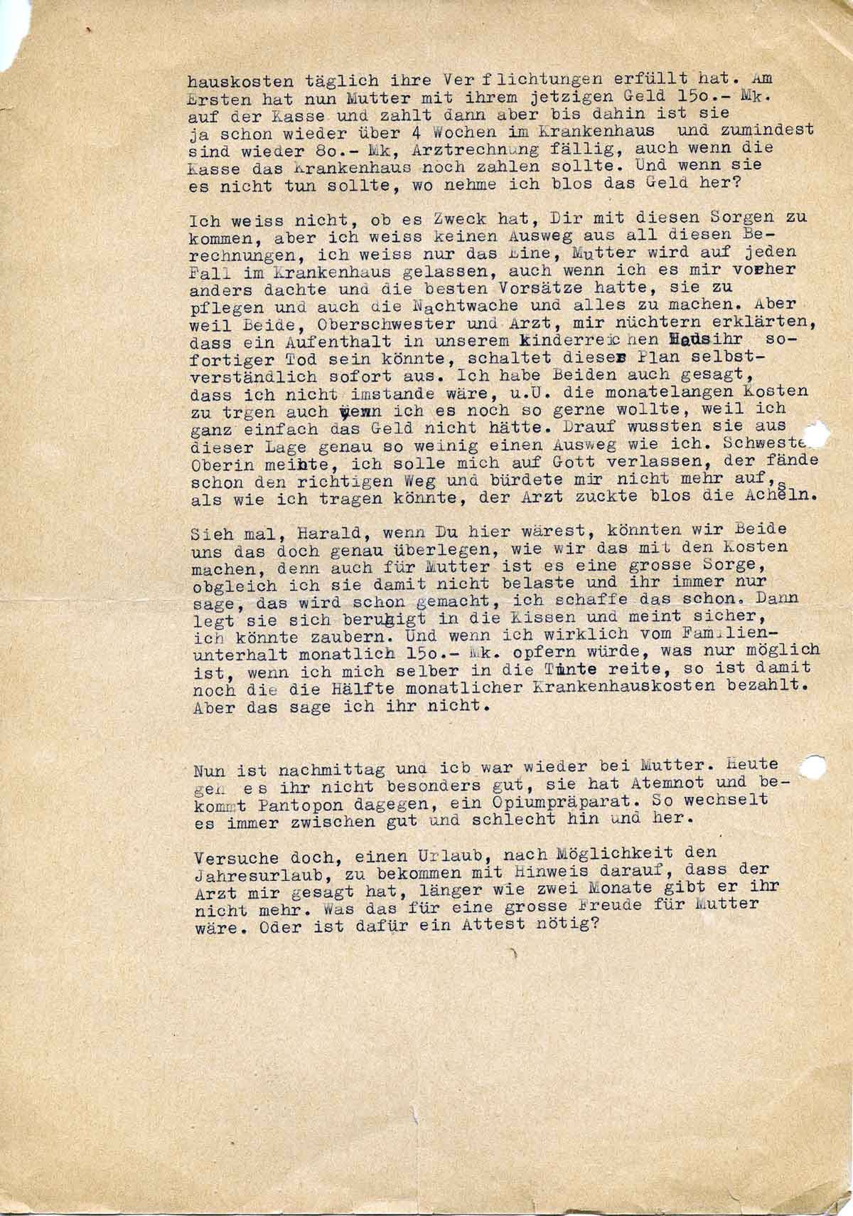 Sieh mal, Harald, wenn Du hier wärest, könnten wir uns doch zusammen überlegen, wie wir das mit den Kosten machen, denn auch für Mutter ist es eine große Sorge, obgleich ich sie nicht damit belaste und ihr immer nur sage, das wird schon gemacht, ich schaffe das schon. Dann legt sie sich beruhigt wieder in die Kissen und meint, ich könne wahrscheinlich zaubern. Und wenn ich wirklich vom Familienunterhalt monatlich 150.- Mk opfern würde, was nur möglich ist, wenn ich mich selber in die Tinte reite, so ist damit noch nicht die Hälfte der monatlichen Krankenhauskosten bezahlt. Aber das sage ich ihr nicht.