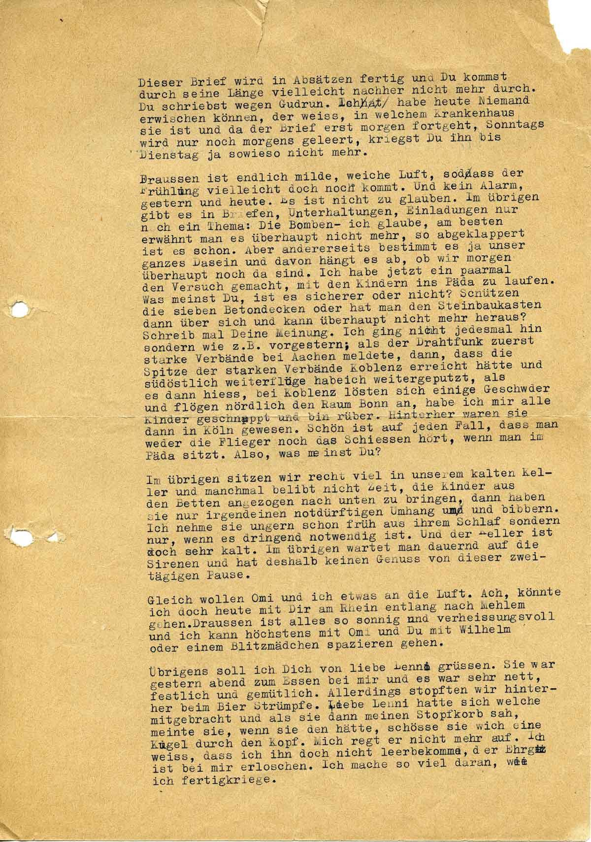 Ich ging nicht jedes Mal hin, wie z.B. vorgestern: Als zuerst der Drahtfunk starke Verbände bei Aachen meldete, dann dass die Spitze der starken Verbände Koblenz erreicht hätten und südöstlich weiterflögen, habe ich weitergeputzt; als es dann hieß, bei Koblenz lösten sich einige Geschwader und flögen nördlich den Raum Bonn an, habe ich mir alle Kinder geschnappt und bin rüber. Hinterher waren sie dann in Köln gewesen. Schön ist auf jeden Fall im Päda, dass man weder die Flieger noch das Schießen hört. Also, was meinst Du?