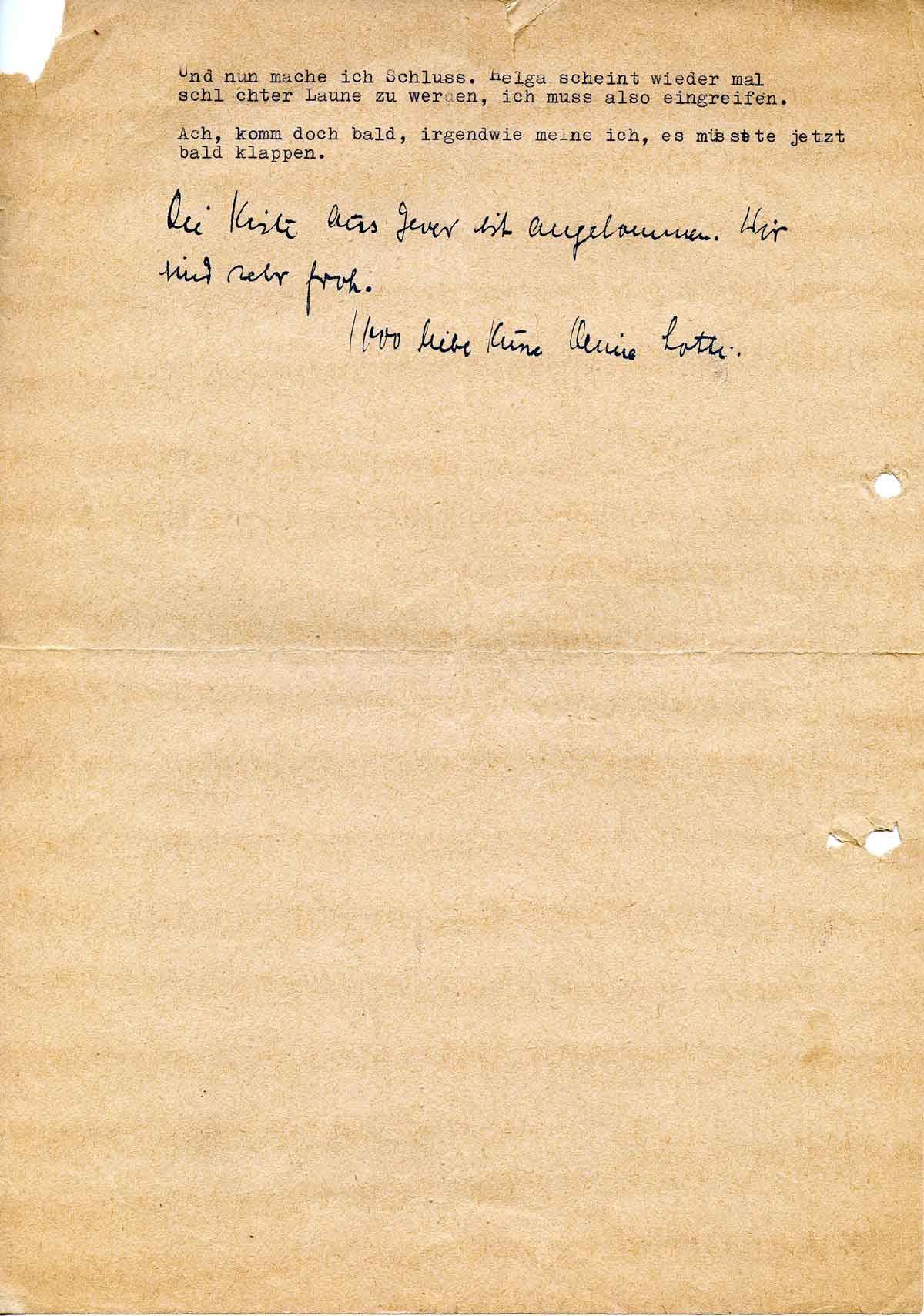 Heute, am Sonntag, bekam ich zwei Briefe von Dir. Schreib nur immer weiter, auch wenn es Zettel sind und auch, wenn Du aus Zeit- und Ruhemangel keine, wie Du meinst, richtigen Briefe schreiben kannst. Wenn ich bloß von Dir höre. Aber endlich möchte ich doch mal einen Brief bekommen, in dem Du schreibst, dass Du Urlaub bekommst.