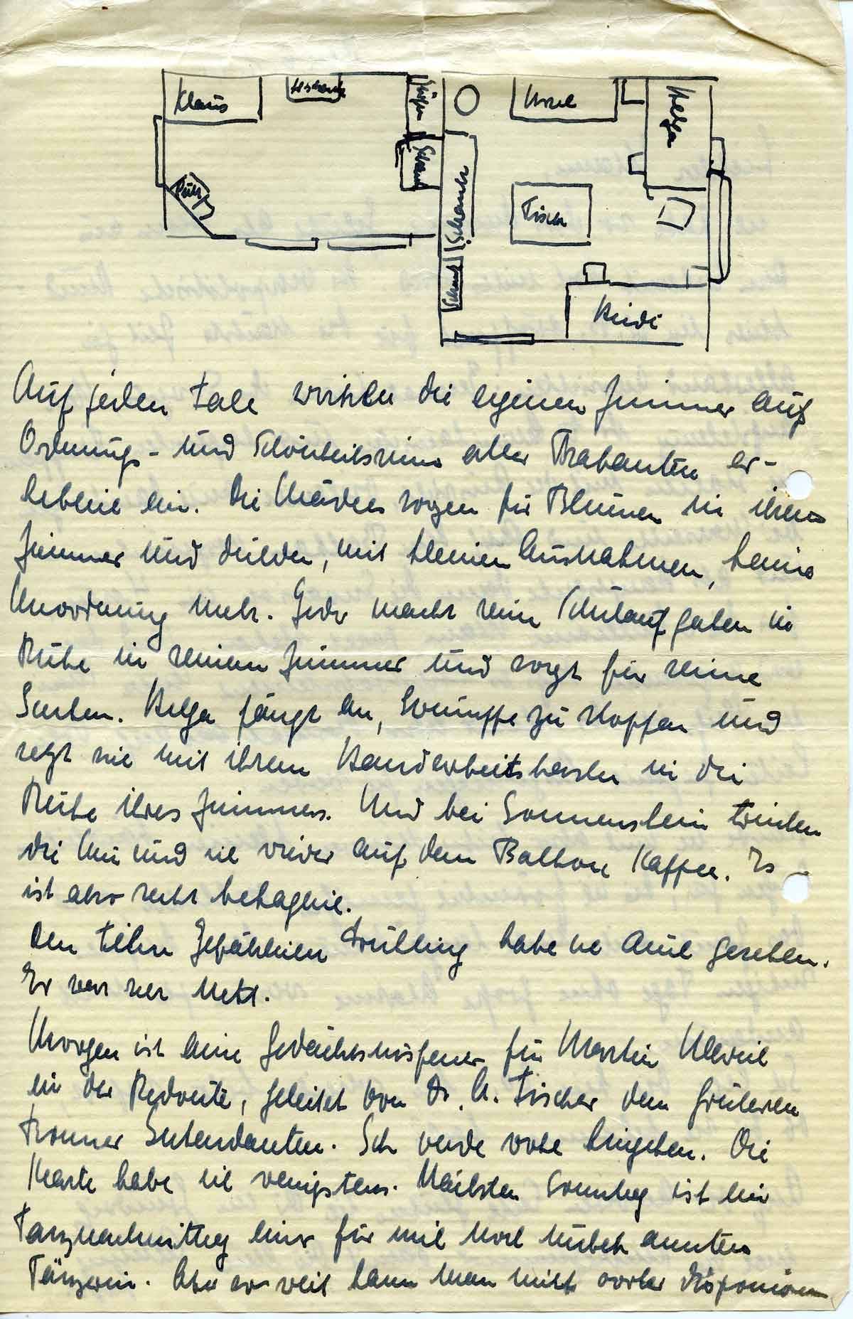 Ich lege Dir hier 20,- Mk. bei, schreibe bitte, ob Du sie bekommen hast. Auf der anderen Seite zeichne ich Dir im Grundriss mal die Kinderzimmer, damit Du eine Ahnung hast.