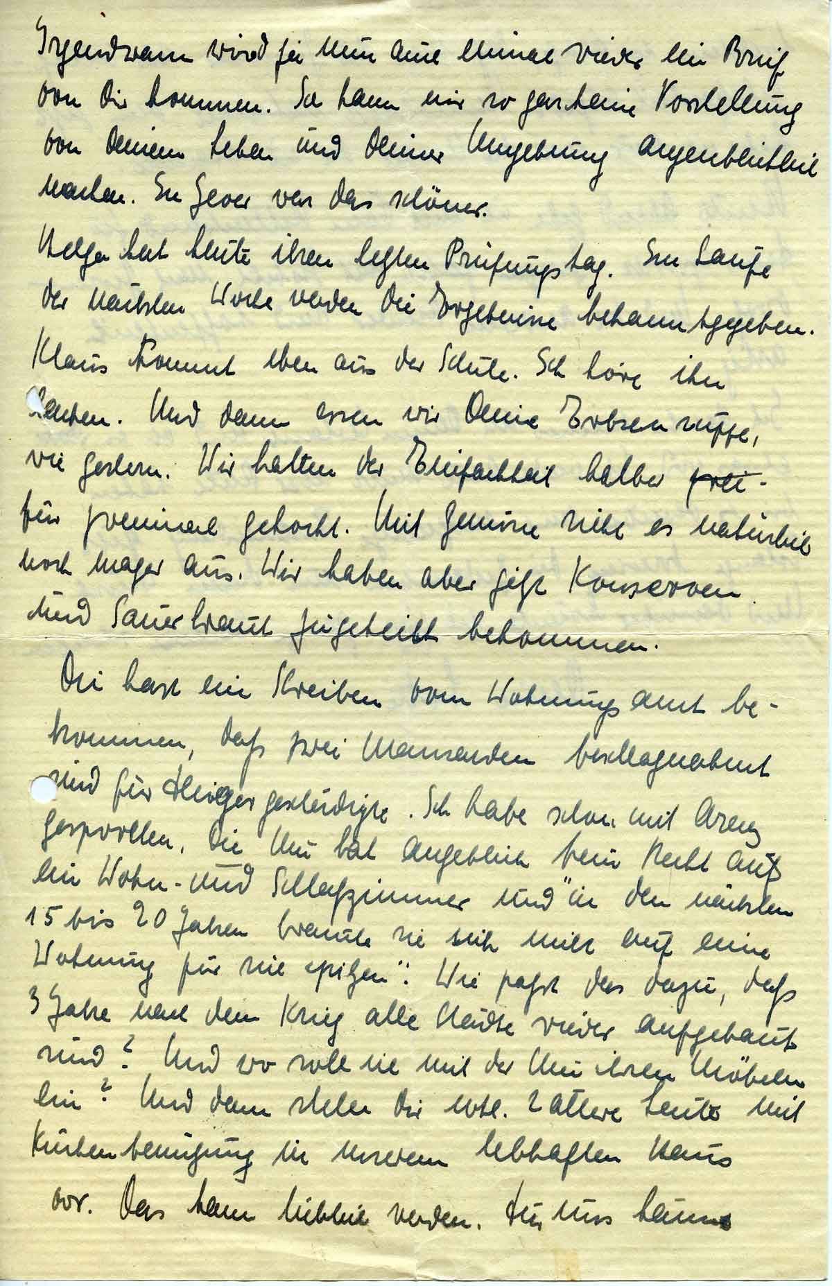 Du hast ein Schreiben vom Wohnungsamt bekommen, dass zwei Mansarden beschlagnahmt sind für Fliegergeschädigte. Ich habe schon mit Arenz gesprochen. Die Mu hat angeblich kein Recht auf ein Wohn- und Schlafzimmer, und in den nächsten 15 bis 20 Jahren brauche sie sich nicht auf eine Wohnung für sich zu spitzen. Wie passt das dazu, dass 'drei Jahre nach dem Krieg alle Städte wieder aufgebaut sind!' Und wo soll ich mit der Mu ihren Möbeln hin? Und dann stell Dir evtl. zwei ältere Leute mit Küchenbenutzung in unserem lebhaften Haus vor. Das kann lieblich werden. Für uns käme