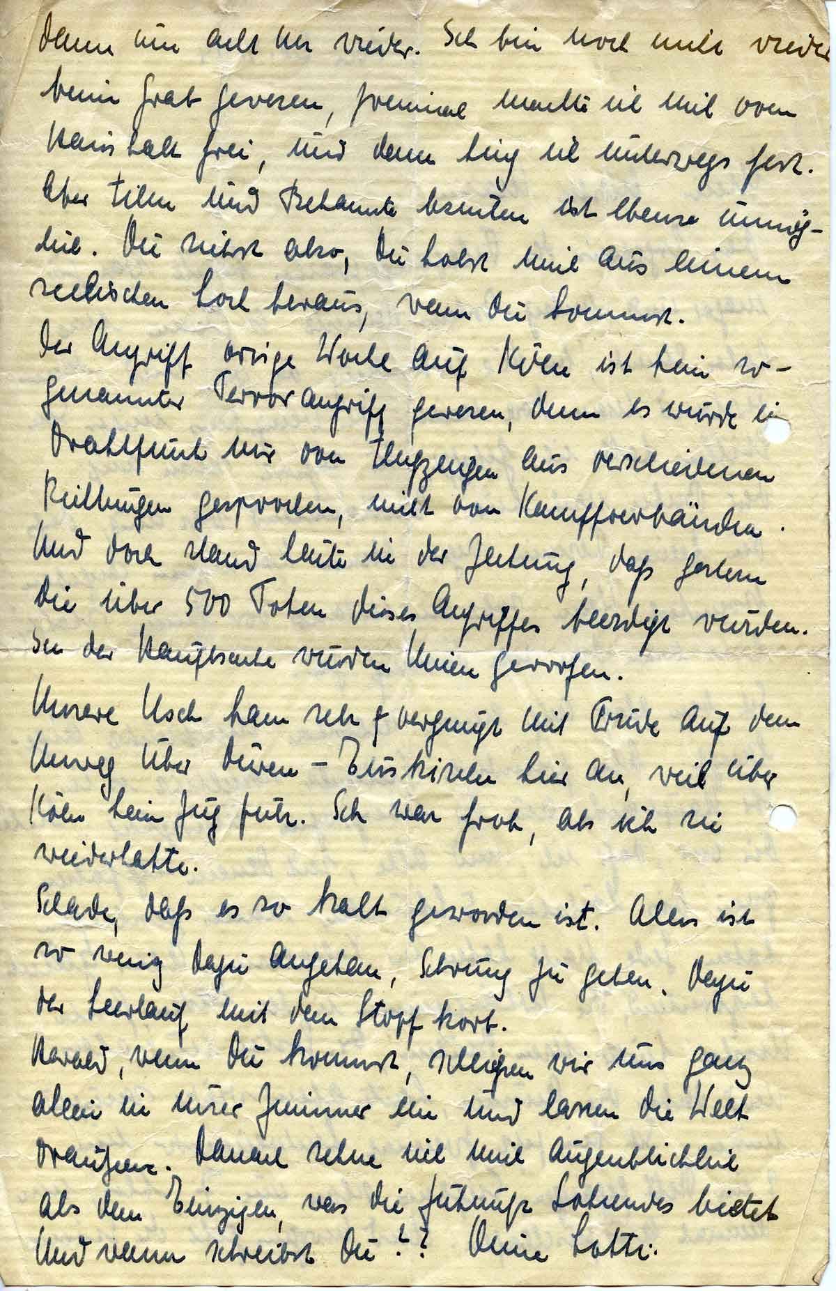 Der Angriff vorige Woche auf Köln ist kein sogenannter Terrorangriff gewesen, denn es wurde im Drahtfunk nur von Flugzeugen aus verschiedenen Richtungen gesprochen, nicht von Kampfverbänden, Und doch stand heute in der Zeitung, dass gestern die über 500 Toten dieses Angriffs beerdigt wurden. In der Hauptsache wurden Minen geworfen. Unsere Usch kam sehr vergnügt mit Trude auf dem Umweg Düren-Euskirchen hier an, weil über Köln kein Zug fuhr. Ich war froh, als ich sie wiederhatte.