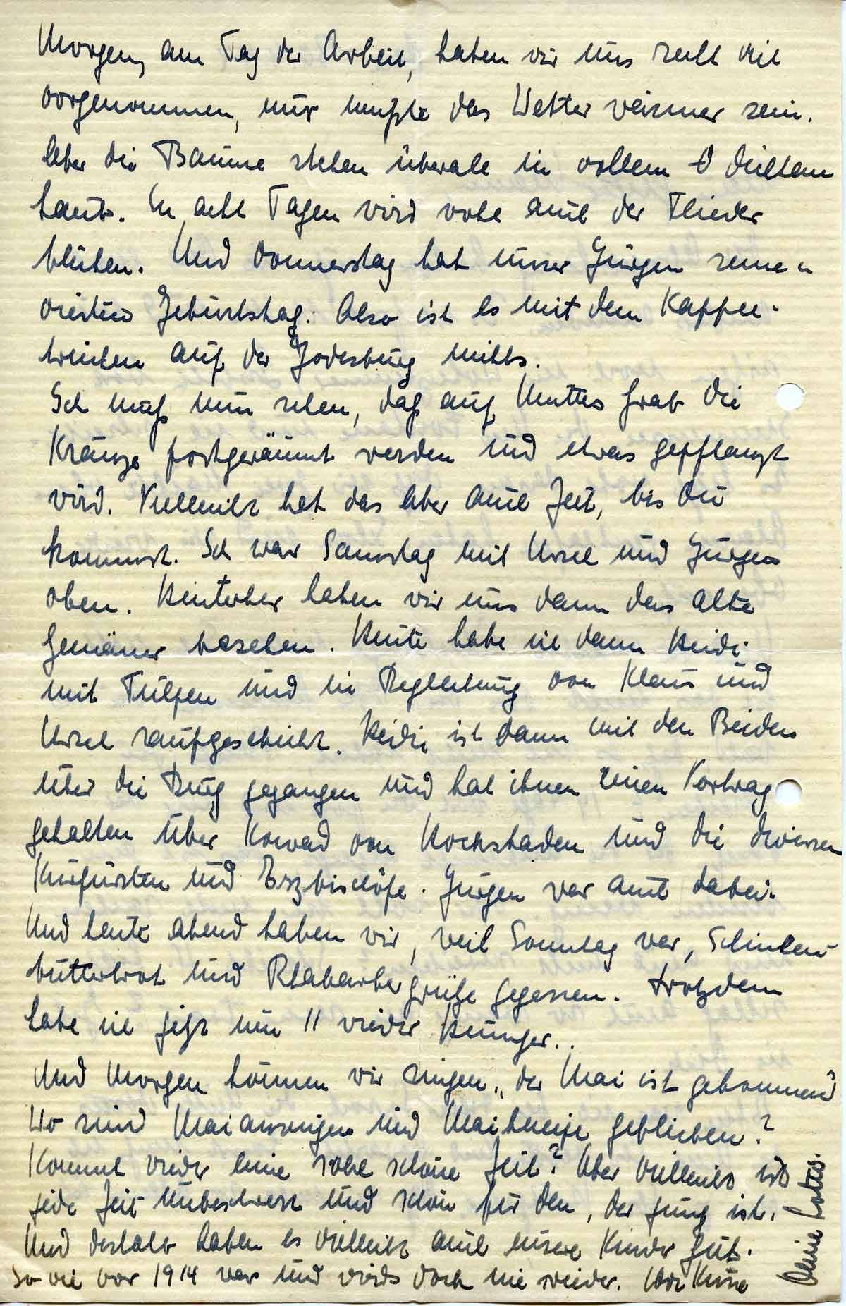 Morgen, am Tag der Arbeit, haben wir uns recht viel vorgenommen, nur müsste das Wetter wärmer sein. Aber die Bäume stehen überall in vollem, dichtem Laub. In acht Tagen wird wohl auch der Flieder blühen. Und Donnerstag hat unser Jürgen seinen vierten Geburtstag. Also ist es mit den Kaffeetrinken auf der Godesburg nichts.