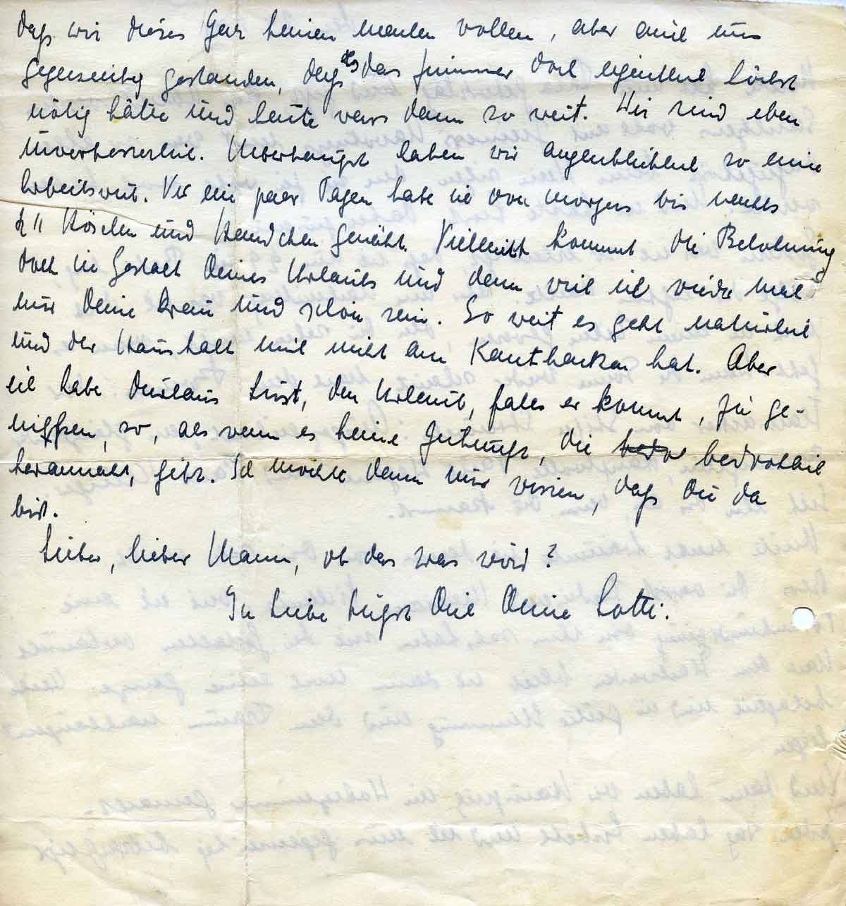 dass wir dieses Jahr keinen machen wollen, aber uns auch gestanden, dass das Zimmer es höchst nötig hätte, und heute war's dann so weit. Wir sind eben unverbesserlich. Überhaupt haben wir augenblicklich so eine Arbeitswut. Vor ein paar Tagen habe ich von morgens bis nachts halb elf Höschen und Hemdchen genäht. Vielleicht kommt die Belohnung doch in Gestalt Deines Urlaubs, und dann will ich nur wieder mal Deine Frau und schön sein. So weit es geht, natürlich und der Haushalt mich nicht am Kanthaken hat. Aber ich habe durchaus Lust, den Urlaub, falls er kommt, zu genießen, so, als wenn es keine Zukunft, die bedrohlich rannaht, gibt. Ich möchte dann nur wissen, dass Du da bist.