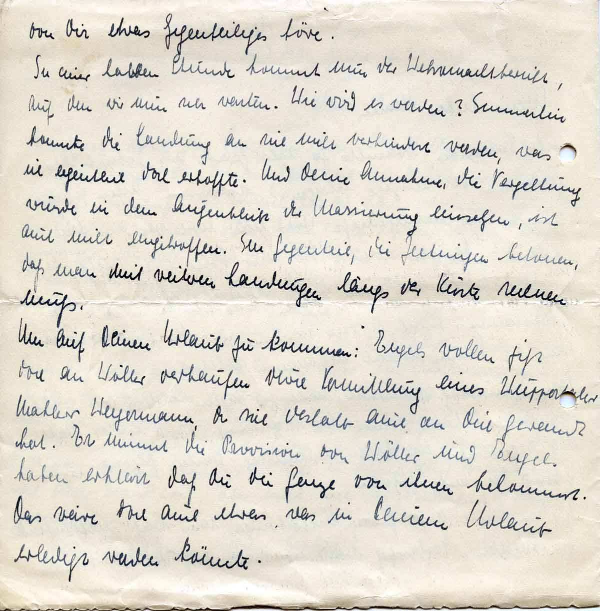 In einer halben Stunde kommt nun der Wehrmachtsbericht, auf den wir sehr warten. Wie wird es werden? Immerhin konnte die Landung an sich nicht verhindert werden, was ich eigentlich doch erhoffte. - Und Deine Annahme, die Vergeltung würde in dem Augenblick der Massierung einsetzen, ist auch nicht eingetroffen. Im Gegenteil, die Zeitungen betonen, dass man mit weiteren Landungen längs der Küste rechnen muss.