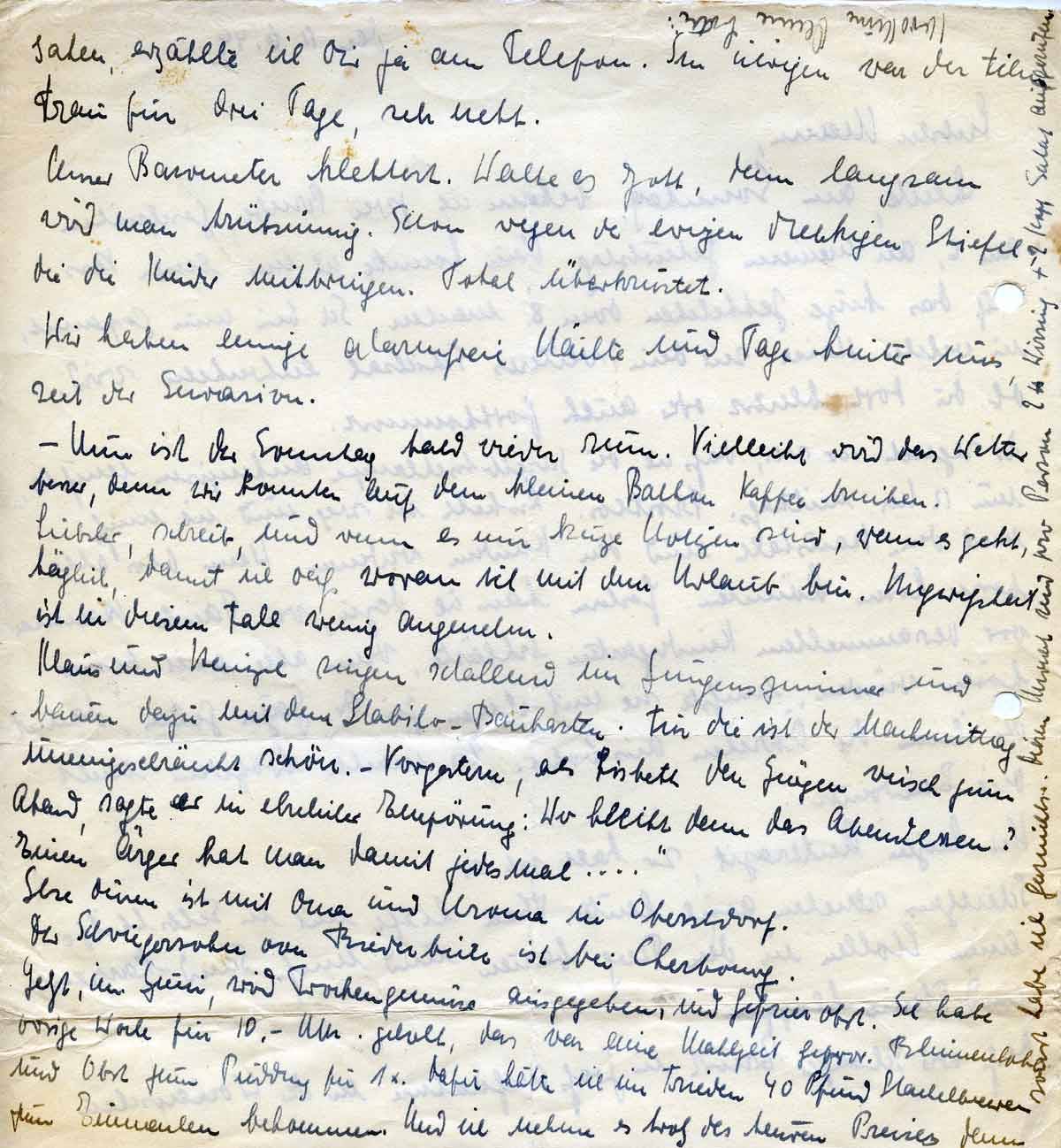 Jetzt, im Juni !!, wird Trockengemüse ausgegeben und Gefrierobst. Ich habe vorige Woche für 10,- Mk. geholt. Das war eine Mahlzeit, gefrorener Blumenkohl und Obst zum Pudding für ein Mal. Dafür hätte ich im Frieden 40 Pfund Stachelbeeren zum Einmachen bekommen. Und ich nehme es trotzdem, denn sonst habe ich gar nichts. Diesen Monat sind pro Person zwei Pfund Wirsing und zwei Kopf Salat aufgerufen.