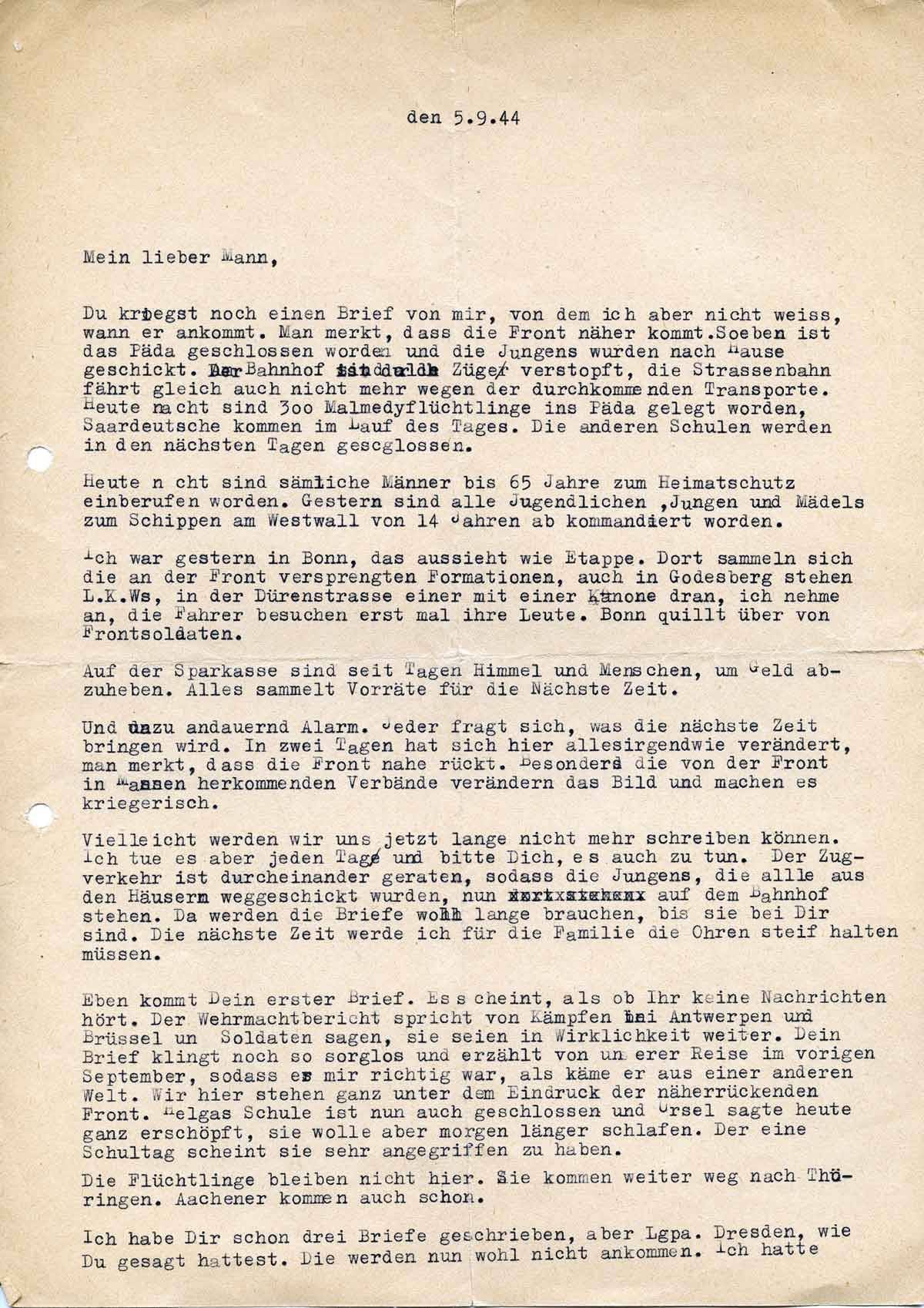 Du kriegst noch einen Brief von mir, von dem ich aber nicht weiß, wann er ankommt. Man merkt, dass die Front näher kommt. Soeben ist das Päda geschlossen worden, und die Jungens wurden nach Hause geschickt. Der Bahnhof ist durch Züge verstopft, die Straßenbahn fährt gleich auch nicht mehr wegen der durchkommenden Transporte. Heute nacht sind 300 Malmedyflüchtlinge ins Päda gelegt worden. Saardeutsche kommen im Laufe des Tages. Die anderen Schulen werden in den nächsten Tagen geschlossen.