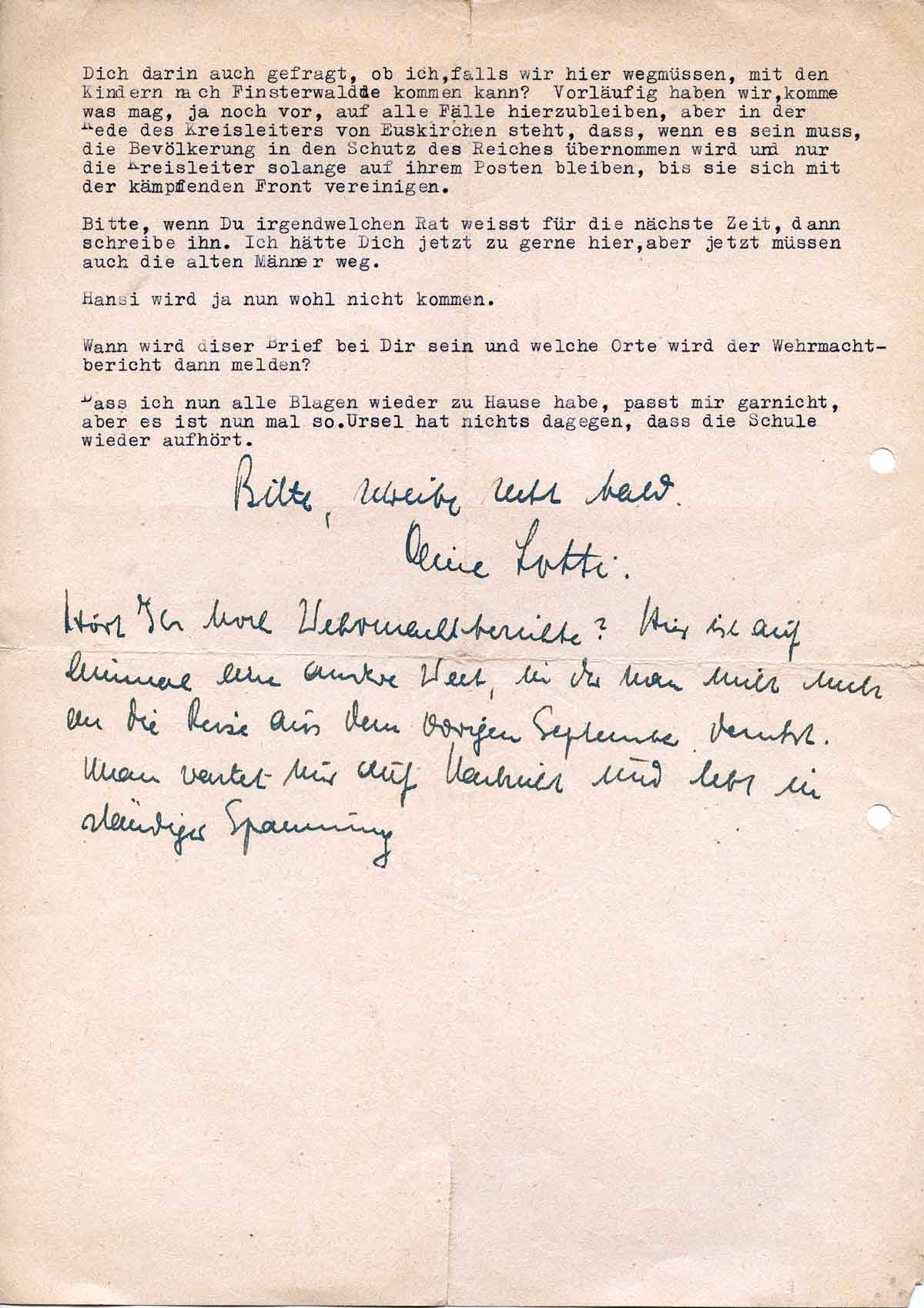 Vorläufig haben wir ja noch vor, komme, was mag, auf alle Fälle hierzubleiben, Aber in der Rede des Kreisleiters von Euskirchen steht, dass, wenn es sein muss, die Bevölkerung 'in den Schutz des Reiches' übernommen wird und nur die Kreisleiter so lange auf ihren Posten bleiben, bis sie sich mit der kämpfenden Front vereinen. Bitte, wenn Du irgendeinen Rat weißt, dann schreibe ihn. Ich hätte Dich jetzt zu gerne hier, aber jetzt müssen auch die alten Männer weg.