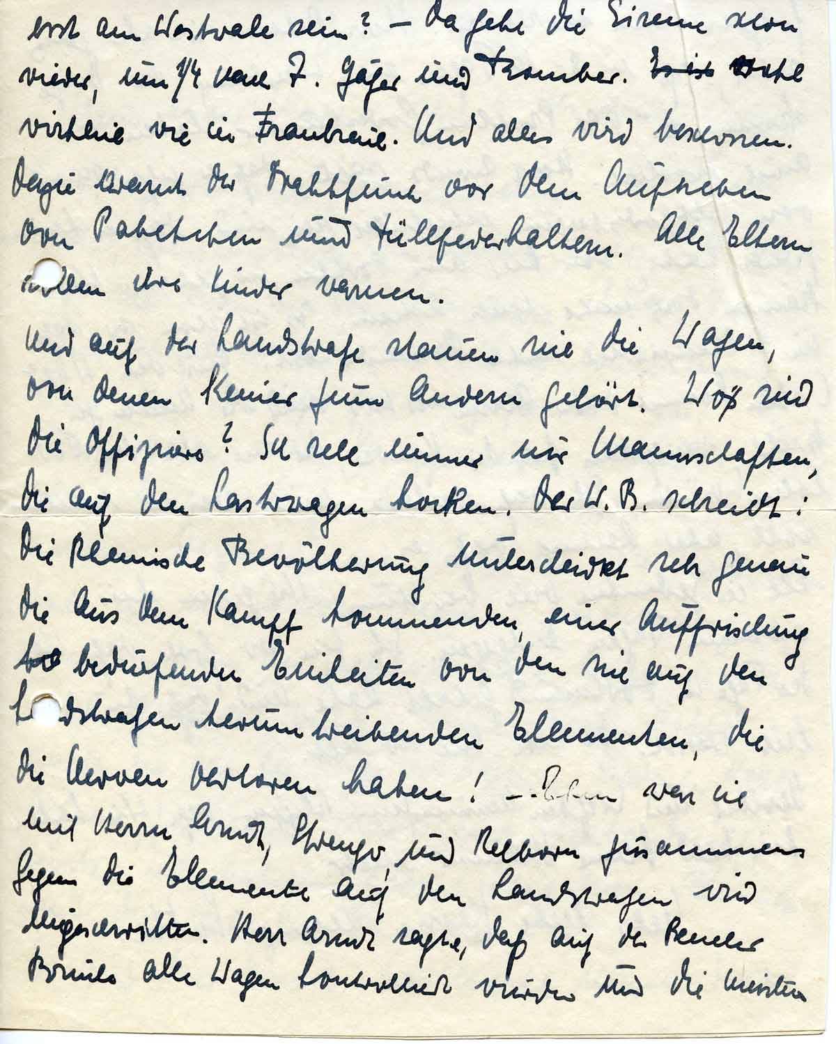 Da geht die Sirene schon wieder! Um viertel nach sieben. Jäger und Bomber. Und alles wird beschossen. Dazu warnt der Drahtfunk vor dem Aufheben von Päckchen und Füllfederhaltern. Alle Eltern sollen alle Kinder warnen. Es sind Explosivgegenstände. Und auf der Landstraße stauen sich die Wagen, von denen keiner zum andern gehört. Wo sind die Offiziere? Ich sehe immer nur Mannschaften, die auf den. Lastwagen hocken. Der 'Westdeutsche Beobachter' schreibt: Die rheinische Bevölkerung unterscheidet genau die aus dem Kampf kommenden, einer Auffrischung bedürfenden Einheiten von den sich auf den Landstraßen rumtreibenden Elementen, die die Nerven verloren haben.