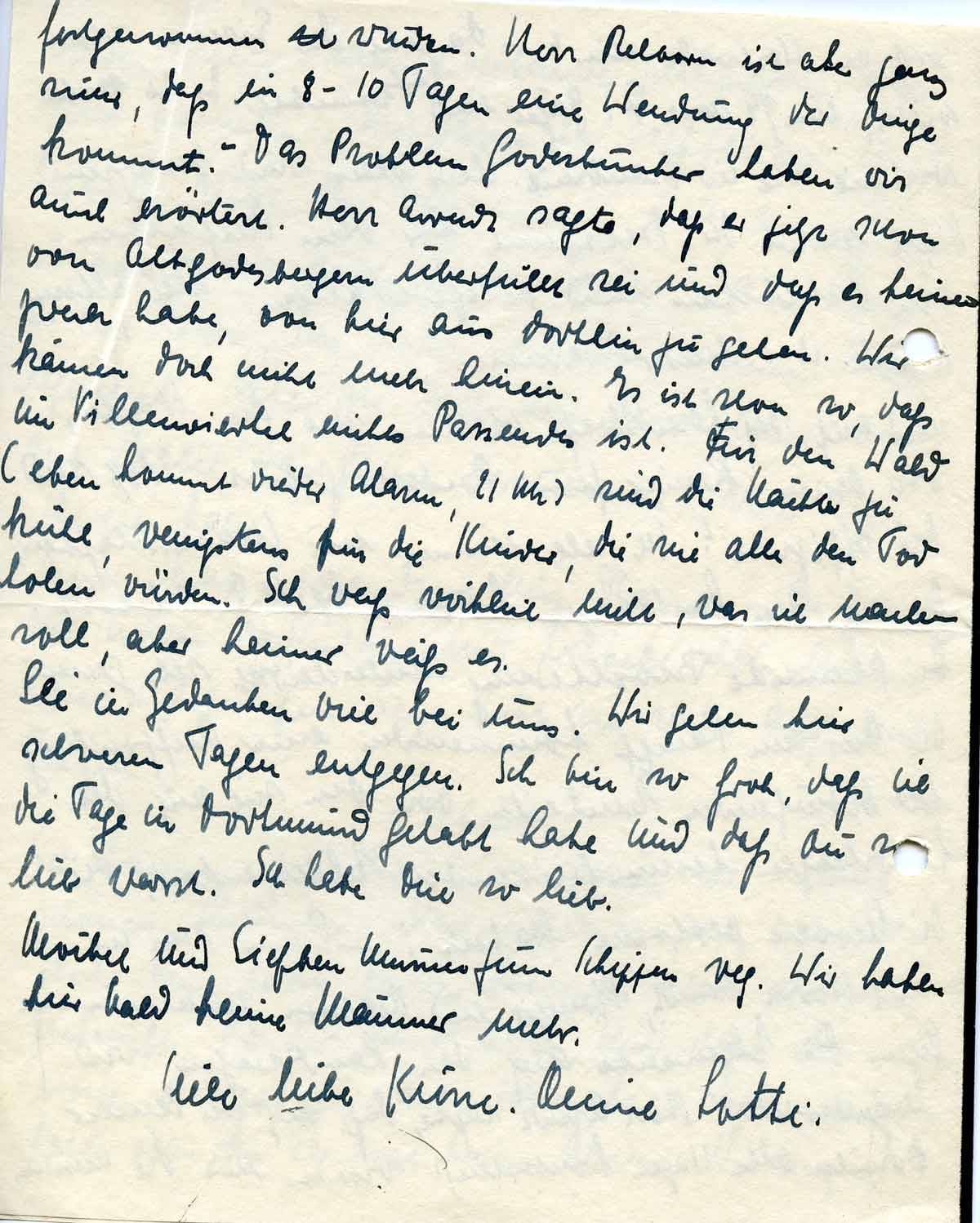 Ich komme zu Dir und denke an unsere schönen Stunden. Weil ich nicht ganz auf der Höhe bin, zerrt heute besonders alles an mir, Zukunft, Kinder und alles. Und dazu die ewigen Tiefflieger. Man kann bald sagen, wir haben öfter am Tag mal keinen Alarm. Wie mag es