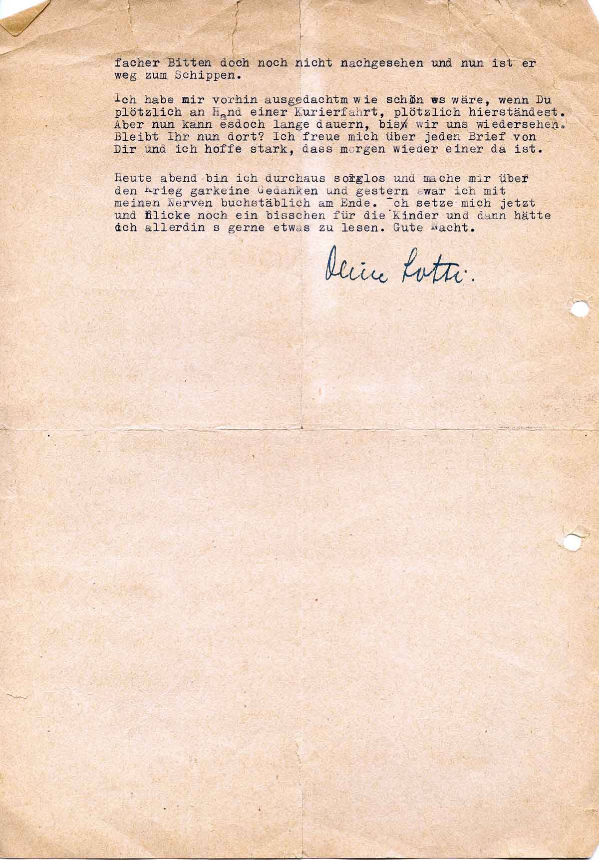 Ich habe mir vorhin ausgedacht, wie schön es wäre, wenn Du plötzlich an Hand einer Kurierfahrt hier ständest. Aber nun kann es doch lange dauern, bis wir uns wiedersehen. Bleibt Ihr nun dort? Ich freue mich über jeden Brief und hoffe, dass morgen wieder einer da ist. -