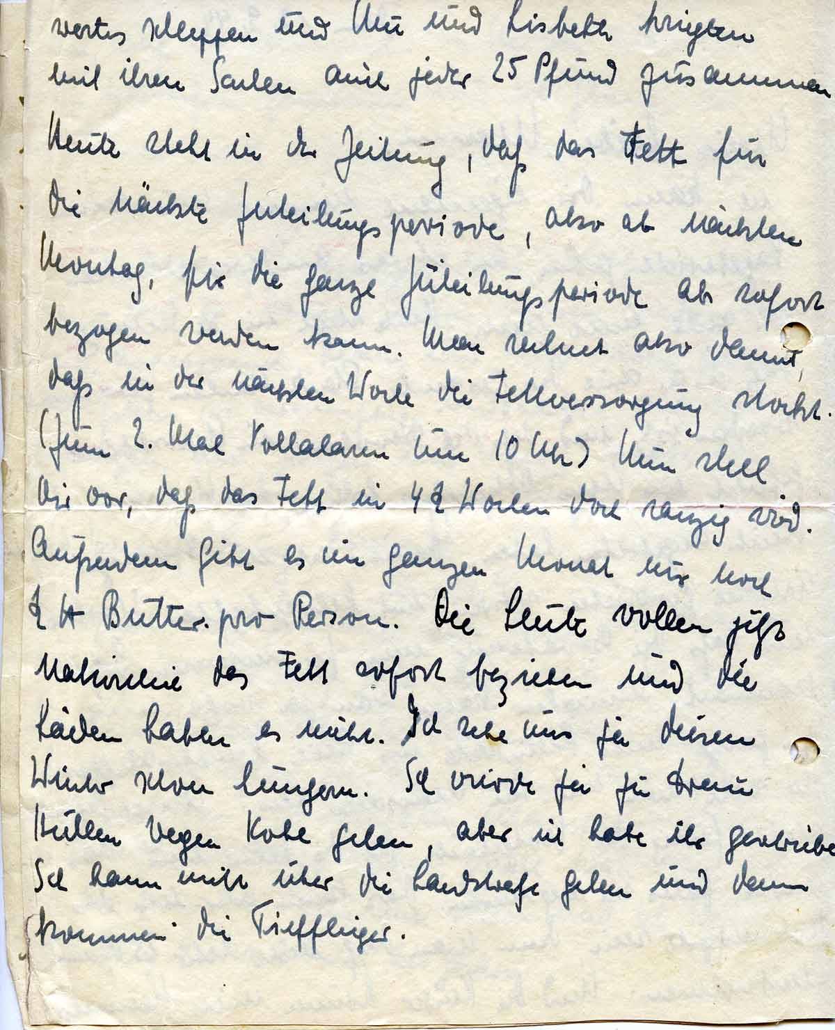 Nun stell Dir vor, dass das Fett in viereinhalb Wochen doch ranzig wird. Außerdem gibt es im ganzen Monat nur noch ein halbes Pfund Butter pro Person. Die Leute wollen jetzt natürlich das Fett sofort beziehen, und die Läden haben es nicht. Ich sehe uns ja diesen Winter schon hungern. Ich würde ja zu Frau Hüllen wegen Kohl gehen, aber ich habe ihr geschrieben. Ich kann nicht über die Landstraße gehen, und dann kommen die Tiefflieger.