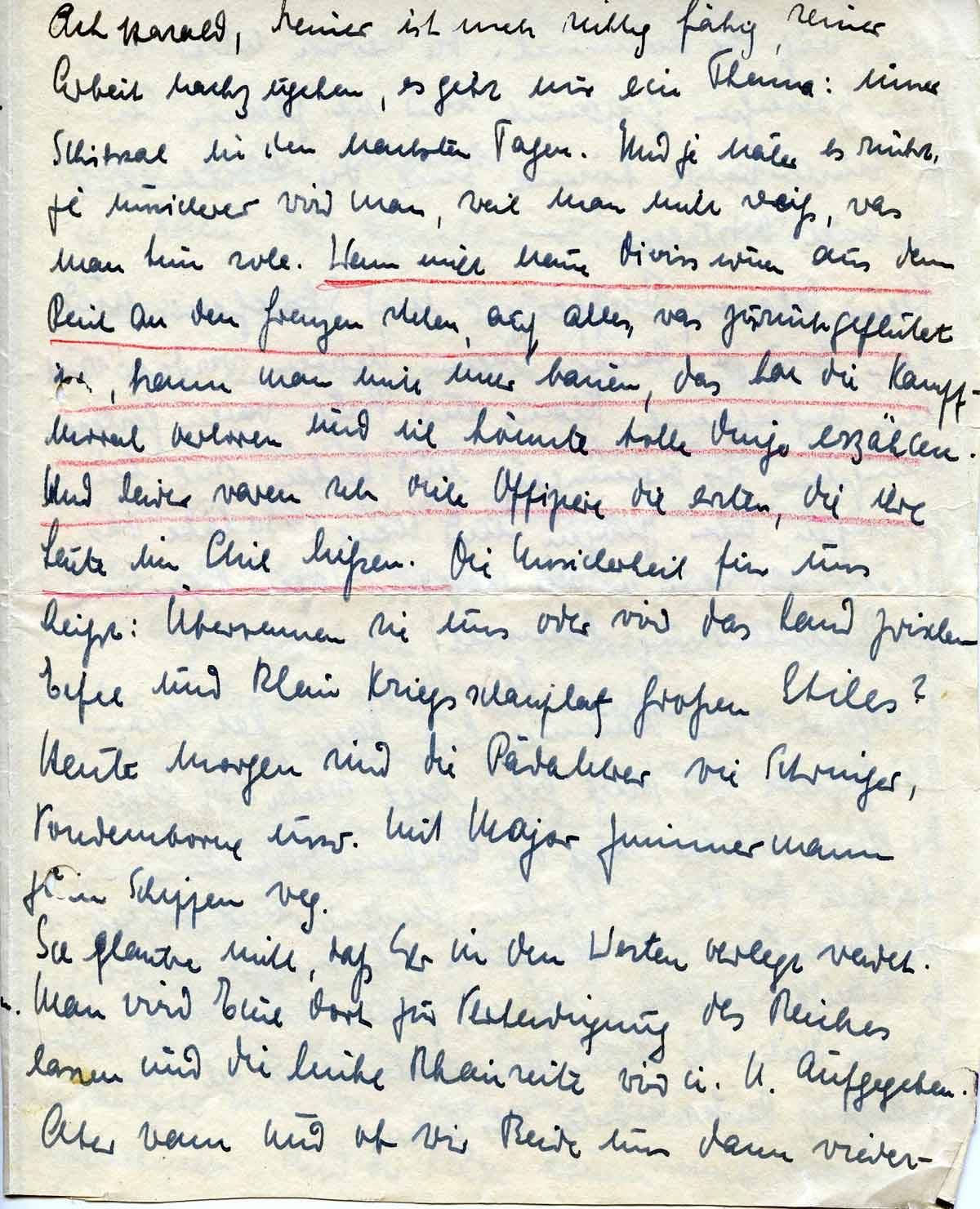 Ach, Harald, keiner ist mehr richtig fähig, seiner Arbeit nachzugehen, es gibt nur ein Thema: unser Schicksal in der nächsten Zeit. Und je näher es rückt, um so unsicherer wird man, weil man nicht weiß, was man tun soll. Wenn nicht neue Divisionen aus dem Reich an den Grenzen stehen - auf alles, was zurückflutet, kann man nicht mehr bauen, und ich könnte tolle Dinge erzählen, und leider waren viele Offiziere die ersten, die ihre Leute im Stich ließen.