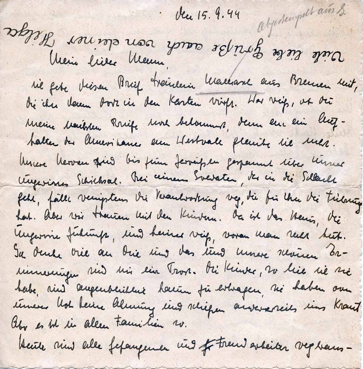 Charlotte Endemann an ihren Mann Harald, 15. September 1944