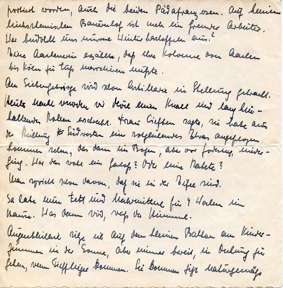 Ich weiß nun nicht, ob Du Sorgen um uns hast oder ob die Lage sich in Finsterwalde harmloser ansieht, als sie ist. Du schreibst von Euren vielen Flugzeugen. Hier ist dafür kein Jäger zu sehen, und die Soldaten von der Front sagten, dass sie ohne Schutz dem Bombardement ausgeliefert gewesen seien. Ich nehme überhaupt an, dass in den nächsten Tagen ein Bombardement losgeht, das sich gewaschen hat, denn laut W.B. stellen die Amerikaner hier an der Grenze ungeheure Menschen-und Materialmengen auf, um einen gewaltigen Durchbruch zu machen. Südlich Aachen wird laut 2-Uhr-Nachrichtendienst gekämpft. Es kann nun noch einige Tage hier gut gehen, es kann auch sehr schnell kommen.